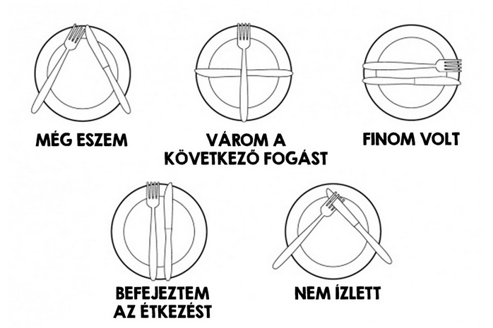 Az asztalra tálalt ételt minden esetben a társaság hölgytagja kezdheti meg! Csak miután elkezdte az étkezést, utána kezdheti a férfi is! Az evőeszközöket mindig a végénél fogjuk meg, és sosem markoljuk! Amennyiben nívósabb étteremben vacsorázunk, előfordulhat, hogy akár nyolc különféle evőeszköz is a tányérunk mellé kerülhet. Leegyszerűsítve: csak haladjunk a széléről a tányér felé. Ha levest fogyasztunk, ne szürcsöljük, és lehetőség szerint ne kapjuk be az egész kanalat. A damaszt szalvétát mindig az öledben kell szétteríteni, semmiképpen sem a nyakadba kötni, a papírszalvétát meg balra a tányérod mellett kell tartani. Az étkezés során vagy befejeztével az evőeszközök elhelyezésével jelezhetünk a felszolgáló felé… (lásd a képet)