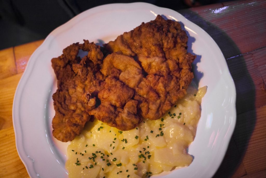 Egy hatalmas adag borjúcombból készített rántott szelet landolt a tányéron, hagymás krumplisalátával. Tökéletesen átsütve, ropogós panírban, hihetetlenül zamatos volt. Sajnos ennek ellenére sem bírtam az egészet elfogyasztani.