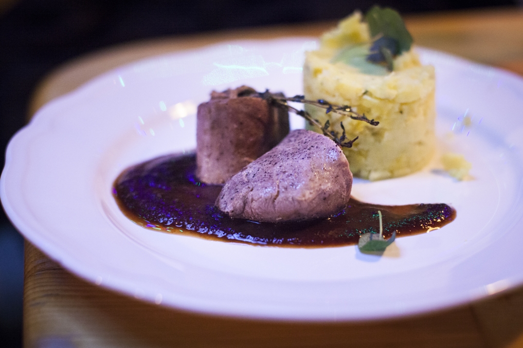 Kellemesen rozéra sült, zamatos töltött szűzérméket kaptunk, amit hagymás tört burgonyával, vörösboros, gyömbéres-szilvás mártással tálaltak. Semmi kivetnivaló nem volt a fogással.