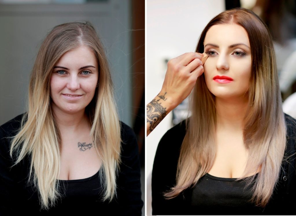 A modell haja „balayage ombre” technikával készült. A 2016-os év őszi-téli trendi színváltozataiban köszön vissza, mely modellünk világos bőrtónusát emeli ki – ezáltal sokkal teltebb, sugárzóbb, magabiztosabb megjelenést biztosítva.