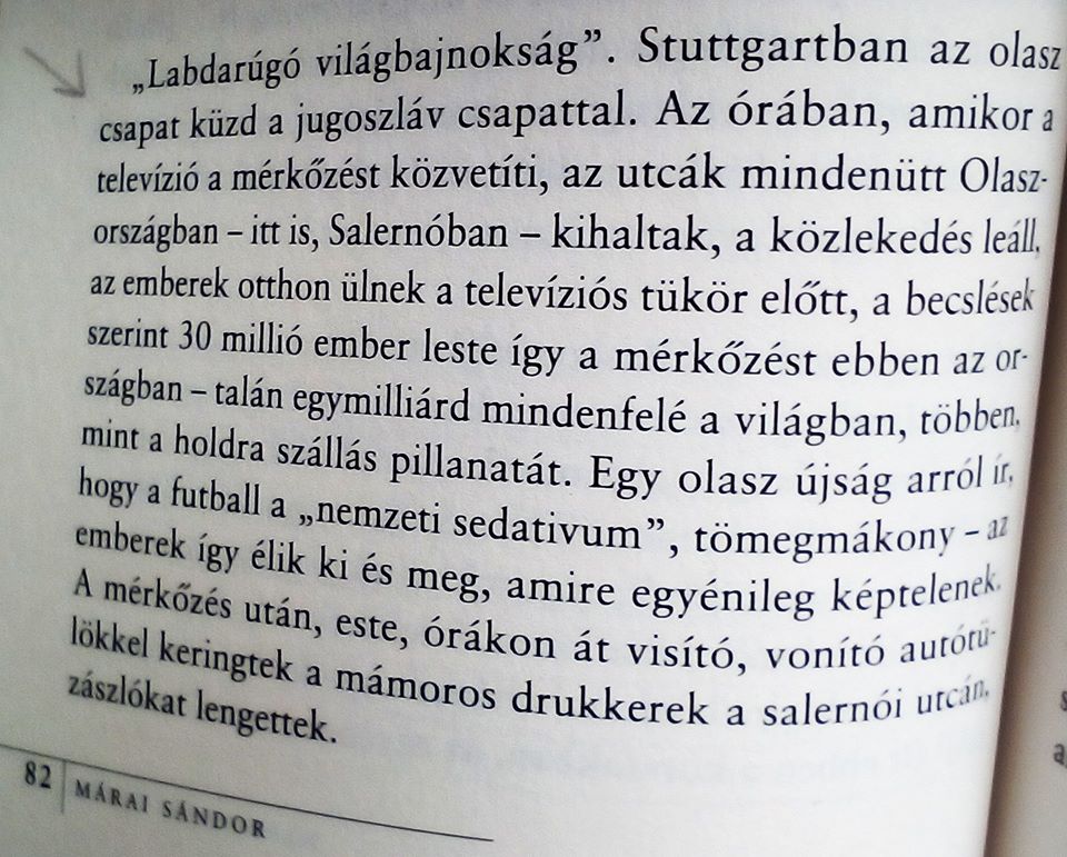 „Labdarúgó-világbajnokság. Stuttgartban az olasz csapat küzd a jugoszláv csapattal. [Stuttgartban az 1974-es vébén Olaszország–Lengyelország mérkőzést rendeztek – a szerk.] Az órában, amikor a televízió a mérkőzést közvetíti, az utcák mindenütt Olaszországban – itt is, Salernóban – kihaltak, a közlekedés leáll, az emberek otthon ülnek a televíziós tükör előtt, a becslések szerint 30 millió ember leste így a mérkőzést ebben az országban – talán egymilliárd mindenfelé a világban, többen, mint a holdra szállás pillanatát. Egy olasz újság arról ír, hogy a futball a „nemzeti sedativum”, tömegmákony – az emberek így élik ki és meg, amire egyénileg képtelenek. A mérkőzés után, este, órákon át visító, vonító autótülökkel keringtek a mámoros drukkerek a salernói utcán, zászlókat lengettek.”