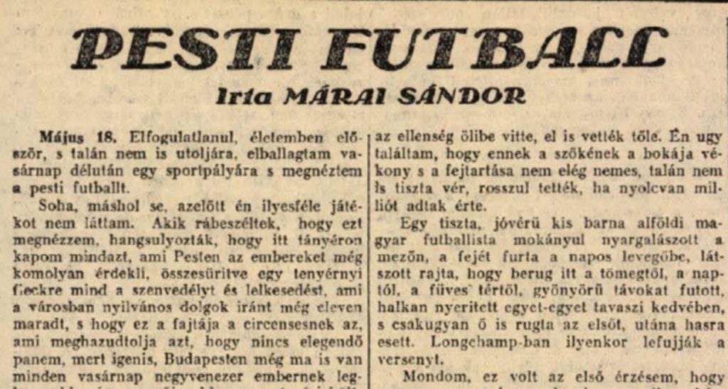 Márai azonban nem akkor és ott látott először futballmeccset, hiszen két évtizeddel korábban, 1928 májusában az Ujság hasábjain már megjelent egy szórakoztató tárcája, Pesti futball címmel, amely így kezdődött: