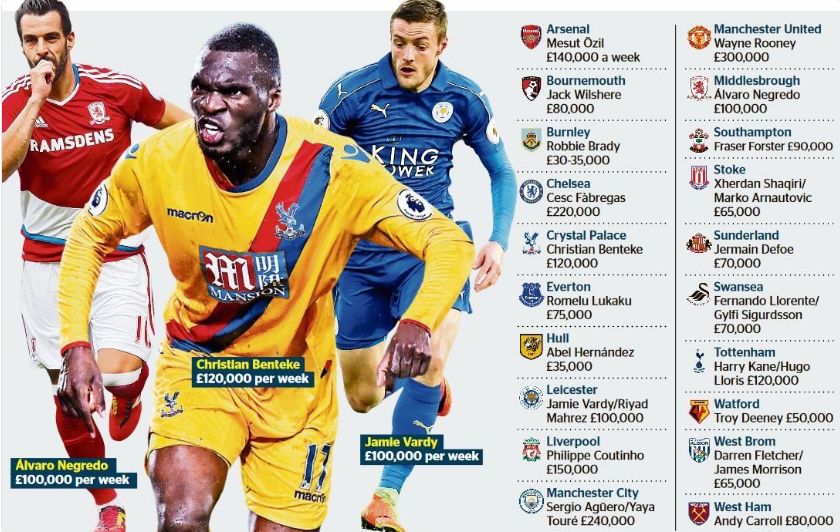 Az angol élvonalbeli klubok legjobban kereső futballistái. (Forrás: Daily Mail)