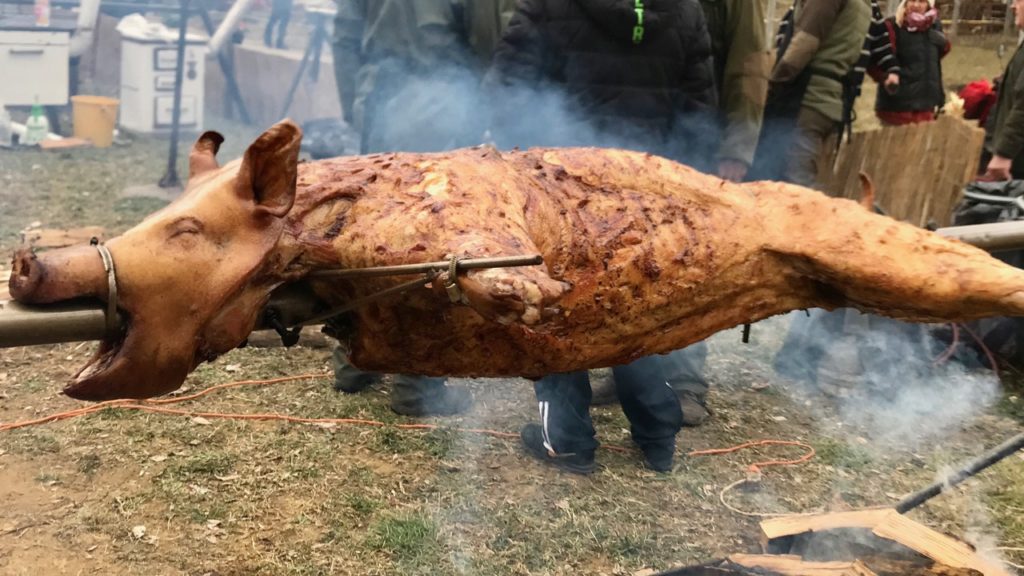 Reggel hat óra! Már mesziről látni és érezni a katlanokból és az üstökből felszálló füstjeleket… Épp időben érkezünk a „tett” helyszínére, Böllérfalvára, ahol a nyitóbeszéd és a böllérkirály, Benke Laci bácsi útbaigazításai után hamarosan elkezdődhet a malacfogás és a malackodás… 🙂