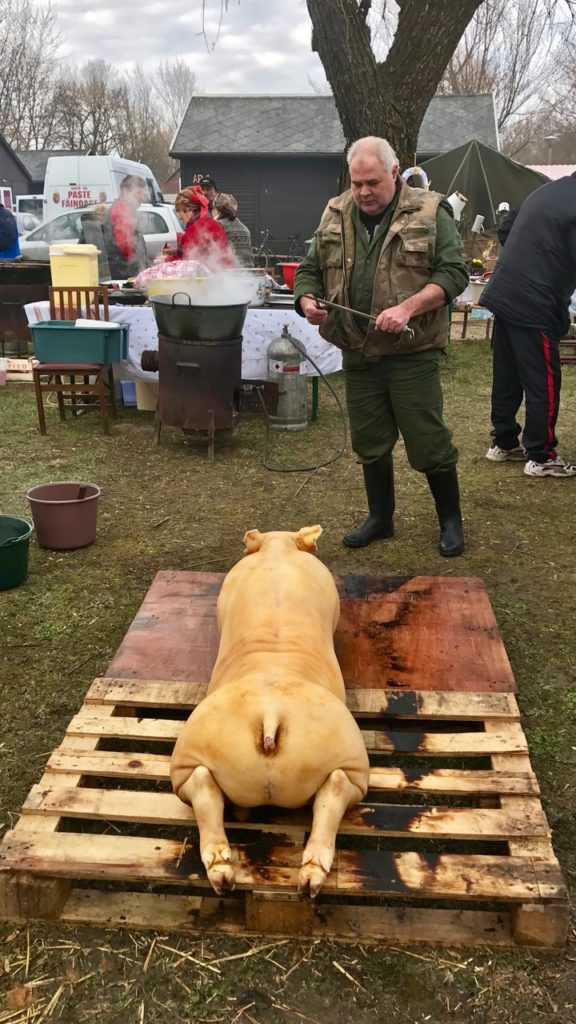 A kisbíró dobszóval és mókával kísérte a csapatokat a vágóhíd oltárához. A hagyományos disznóvágás első lépéseként a jelenlévők felhajtották a reggeli bátorító vagy fogópálinkát, és szépen sorrendben elkezdődhetett a malacok torokműtétje. 🙂