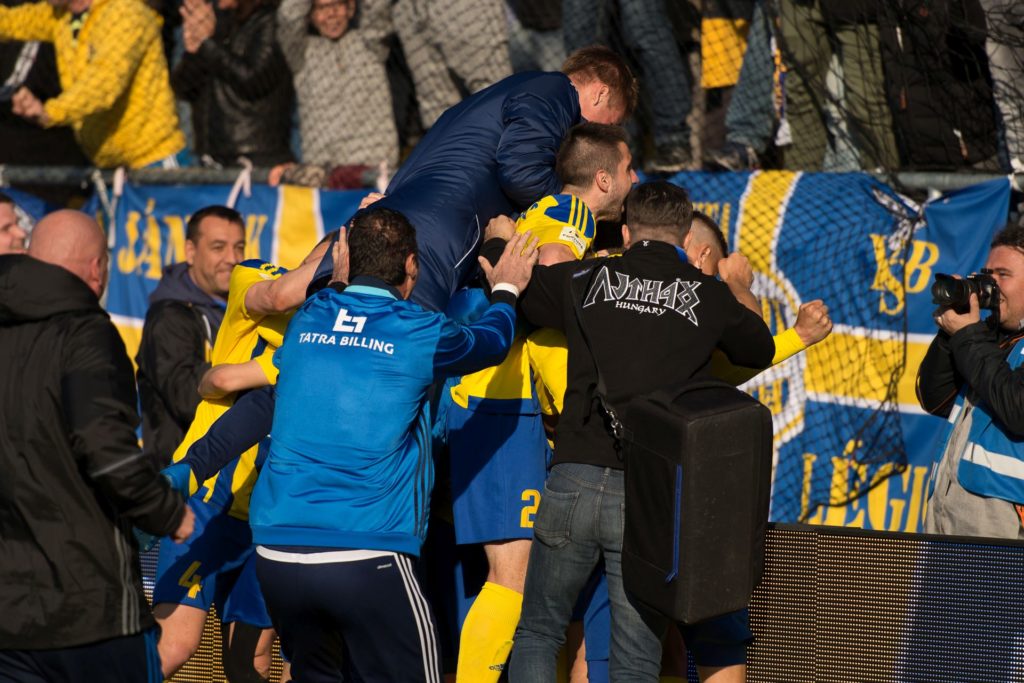 Három sípszó, és vége! Őrült extázist a lelátókon kíséri az ölelgetés a cserepadnál. Megyünk Jojoval fotózni, egy öleléssel és vad kiáltásokkal örülünk László Csabával.