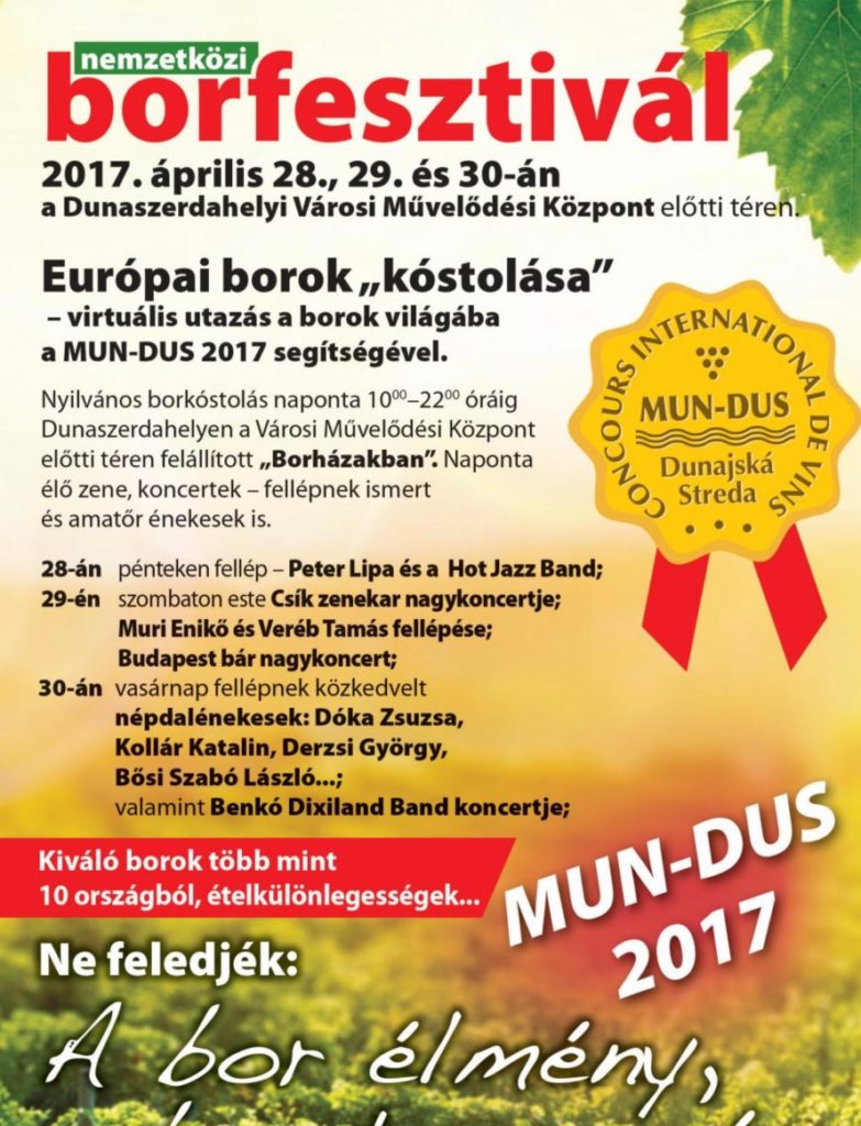 Idén minden eddiginél változatosabb programmal várjuk a kedves látogatókat a dunaszerdahelyi Csaplár Benedek VMK előtti térre, az ország egyik legnagyobb borfesztiváljára, amelyre a belépés idén is díjtalan. Dunaszerdahely önkormányzata a MUN-DUS társrendezője, idén is a helyszínnel, valamint a kultúrprogram teljes megszervezésével járulnak hozzá. E három nap alatt fellépnek ismert és amatőr zenekarok egyaránt. Láthatjuk és hallhatjuk többek közt Peter Lipát, a Hot Jazz Bandet, a Csík zenekart, Muri Enikő és Veréb Tamás előadását, továbbá a Budapest Bár és a Benkő Dixiland Band zenekarokat. A vendégek mindemellett a Csallóköz legjobb énekesei által kísért kellemes nótaesten is mulathatnak.