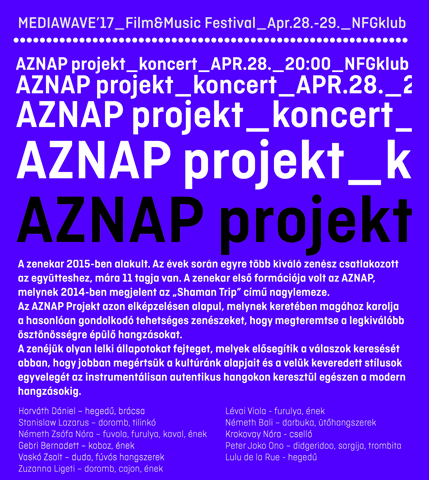 Péntek este a filmvetítéseket az AZNAP projekt koncertje követi, amely este 20.00 órakor kezdődik. A 11 tagú zenekar azon elképzelésen alapul, melynek keretében felkarolja a hasonlóan gondolkodó tehetséges zenészeket, hogy megteremtse a legkiválóbb ösztönösségre épülő hangzásokat.