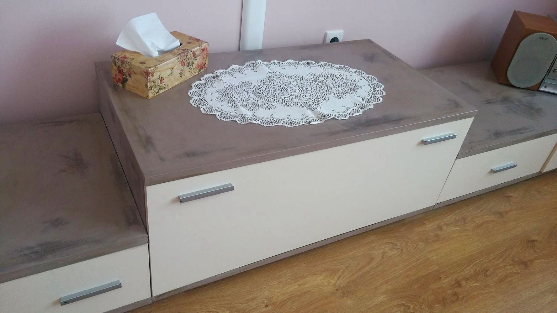 Lett is! Az elképzelés már megvolt, én pedig igyekeztem mindent úgy csinálni, ahogy azt megbeszéltük. A technika és a szín is megvolt, visszacsiszolt lett végül, amolyan „shabby chic” stílusú, színben pedig közel kellett állnia a mályvához, amilyen a fal színe is lett.