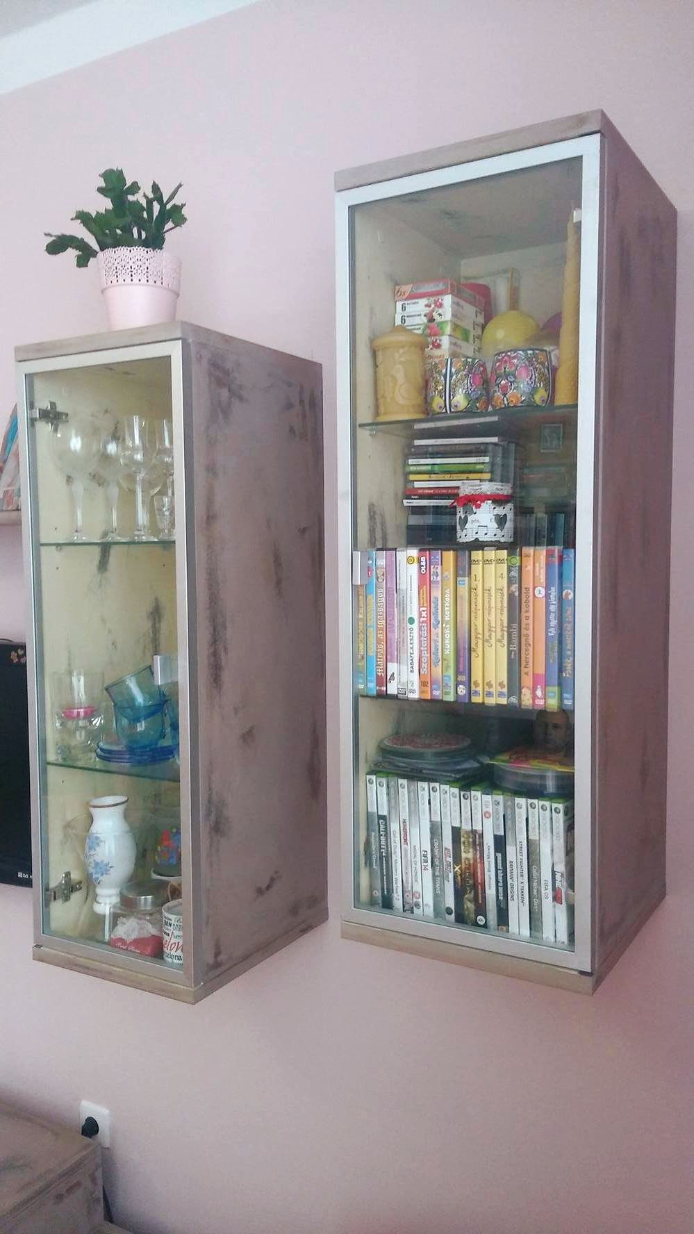 A sötétbarna felületet lefestettem egy rétegben, hogy a visszacsiszolásnál ne legyen felesleges munkám. Két vitrin belseje is krémszínűvé vált, hogy jobban illeszkedjen az ajtófrontokhoz.