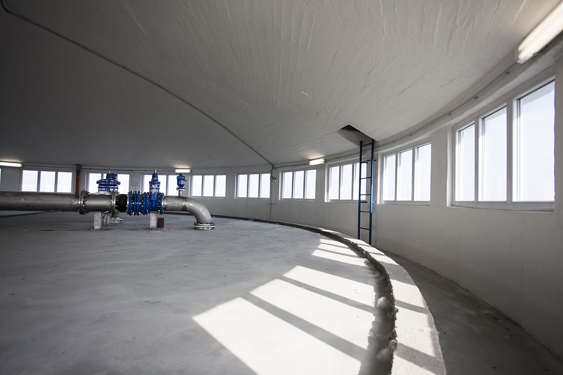 …és ide. Ez a tartály teteteje. Egy kör alakú helyiség, körben ablakokkal. Jó kis kávézót lehetne itt csinálni, csak a lépcsőzést kellene megszokniuk a vendégeknek.
