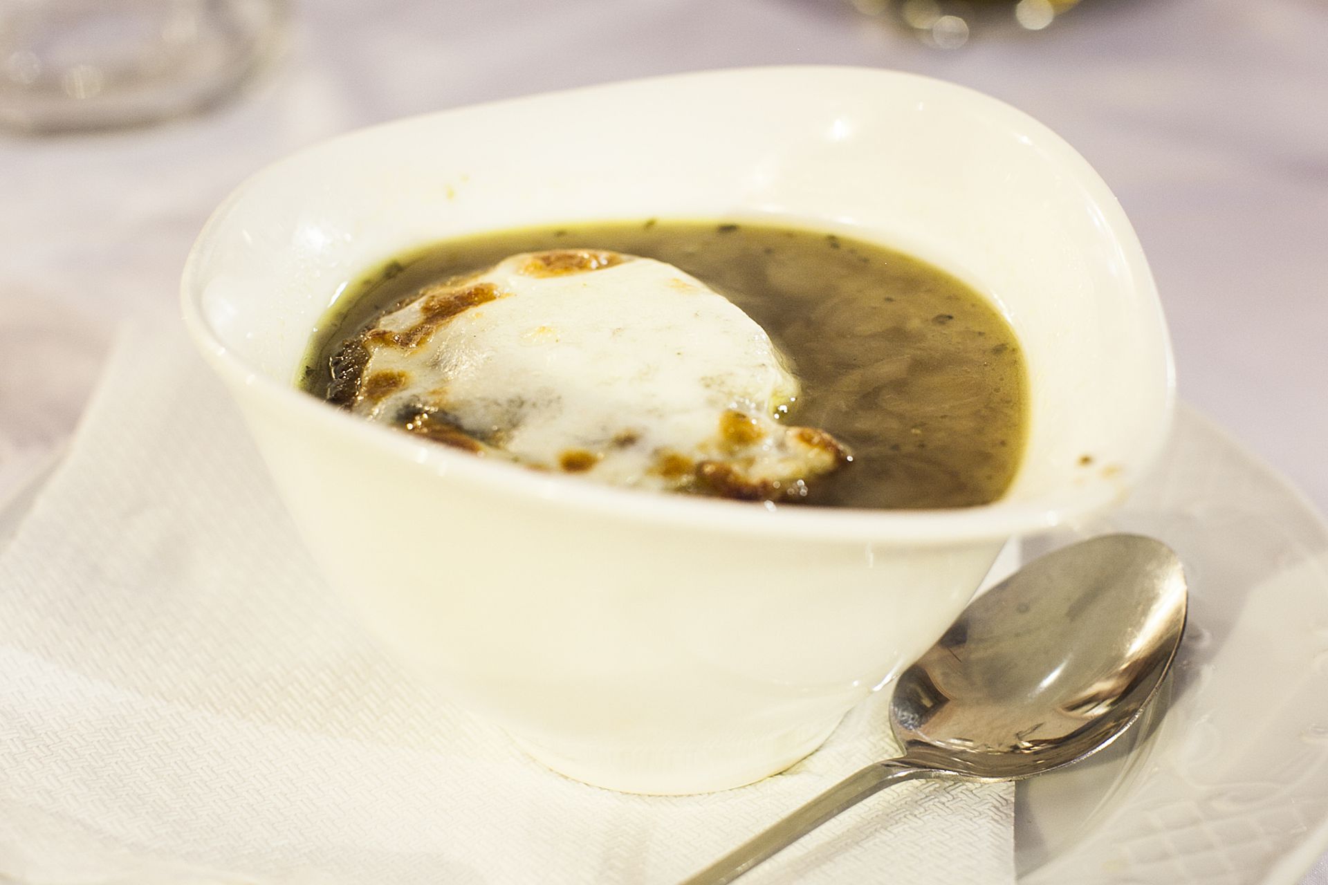 A sajtos pirítóssal tálalt hagymaleves (4,20 €) talán a világ legegyszerűbb és legnagyszerűbb levese. Érezhető a karamellizált cukor és a pirított hagyma okozta ízkavalkád, amely a belehelyezett sajtos pirítóssal kitűnő.