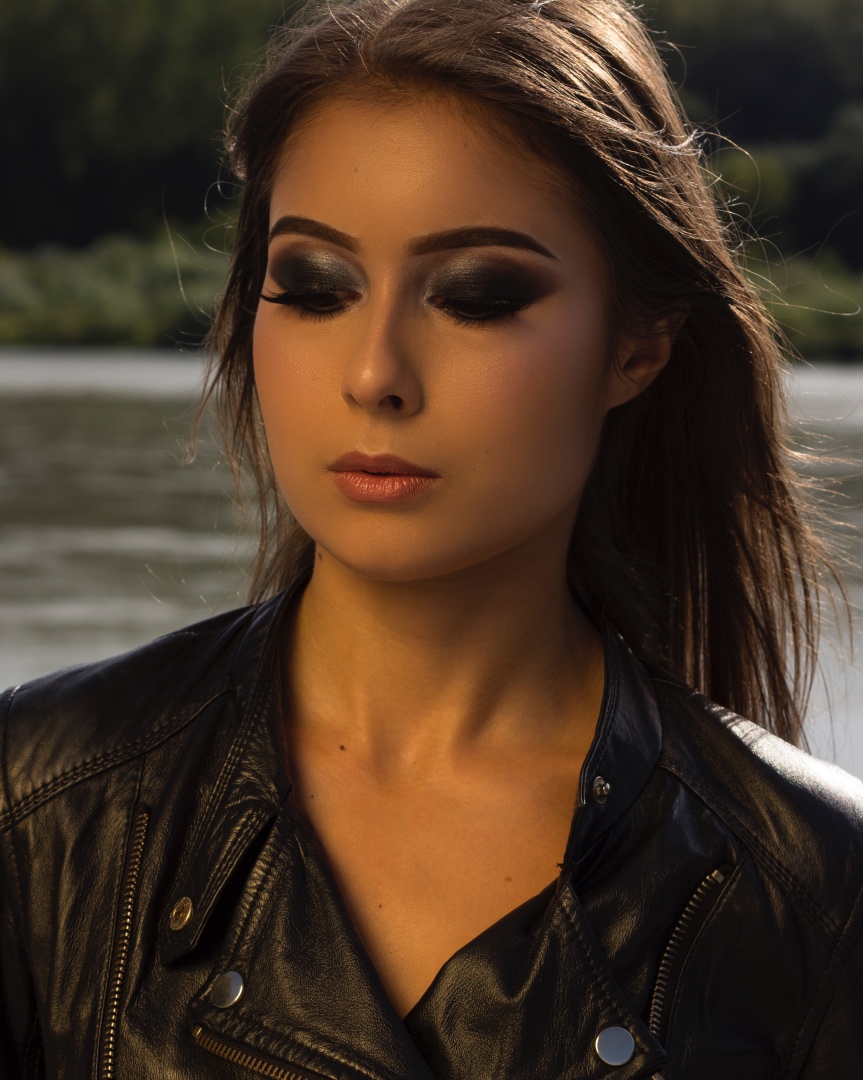 Az első sminknél egy klasszikusra esett a választásom, amivel nem lehet mellélőni, és szinte mindenkinek jól áll, a füstös szem, ami remekül összehozta a modellt Kocsis Lisát a kép tartalmával.