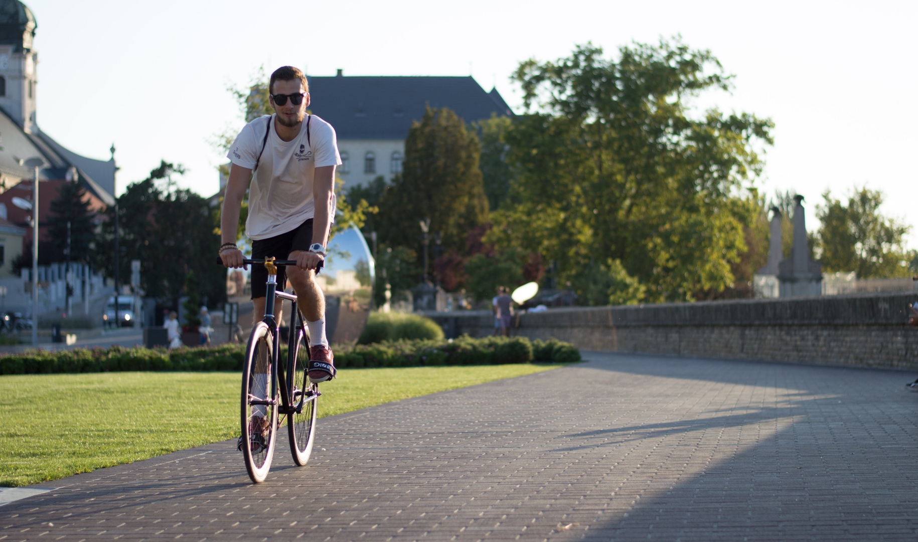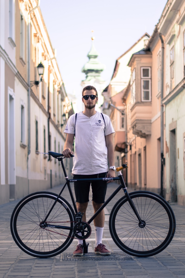„Egy mondattal: a fixie egy egysebességes aggyal rendelkező kerékpár. Manapság gyakori a régi versenybiciklik stílusos egyéni felújítása. A szabadidejében ezzel foglalkozik egyik jóbarátom, Dömény Gergely, aki „kipofozta” és életet lehelt a fotókon látható szépségbe. Győr városa nagyon szép, de fixie bringáról nézve még szebb…”