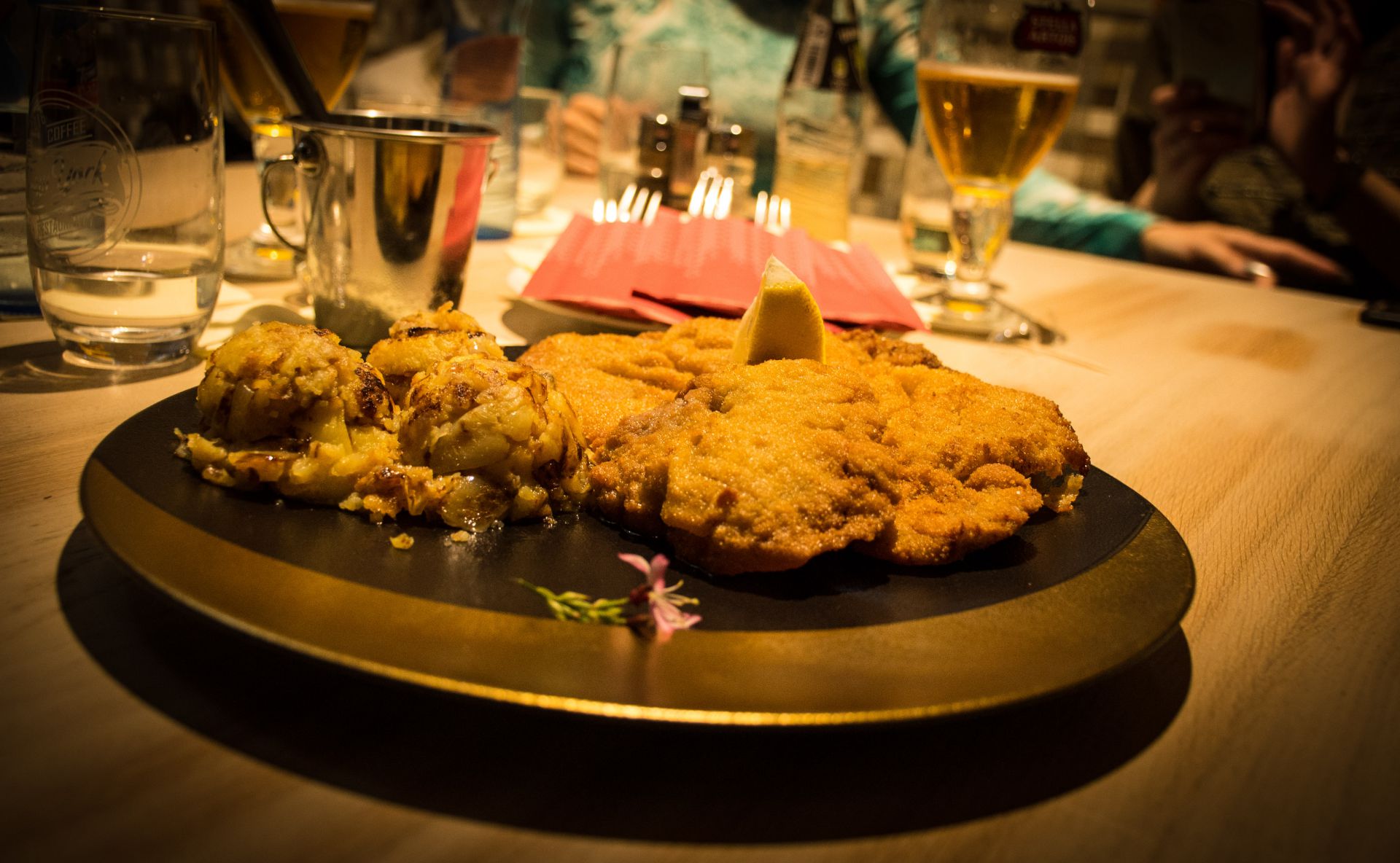 Bécsi szelet, hagymás törtburgonya (16,80 €)