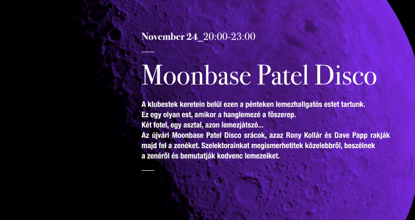 Elérkezett a hét legjobb napja, azaz a péntek! Erre a napra várunk a munkahét megkezdése óta, hogy végre lazíthassunk, bulizhassunk, vagy kulturálódhassunk kedvünkre. November utolsó hétvégéje megannyi zenés és egyéb kultúrproggammal kezdődik, kiválasztottam pár érdemeset, válogassatok! (Címlapfotó: Kürthy Béla, Moonbase Patel Disco az NFG nyitóbuliján)