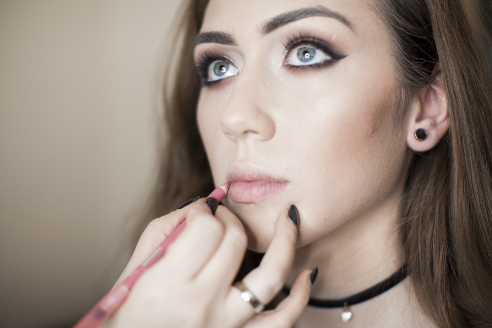 - Ajkait először kontúrceruzával rajzolta meg, mellyel nem csak egy vékony vonalat húzott, picit eldolgozta azt. Utána fénylő szájfényt kapott modellünk.