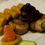 A steak és a mártás együtt kiemelkedő ízvilággal ajándékozta meg a fogyasztóját. A vastag hússzeletet puha, rosé belső jellemezte, amely baconnel volt körbetekerve, finom, omlós libamájjal meghintve, barnamártással leöntve. Itt újra megjelent az „ipari” krokett, viszont maga a sertés szűz kifogástalan volt. Borász társam teljesen el volt ragadtatva az ízek harmóniájától, amelyhez gyönyörű színű, kellemes, enyhén hordó ízű Rajnai rizlinget fogyasztott.
