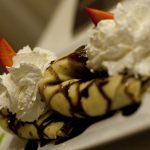 A túrós-diós palacsinta (2,90 €) is méretes adag, ízletes túró- illetve diós töltelékkel, csokival, tejszínhabbal bőségesen nyakon öntve. Az első díjat a flambírozott gyümölcsnek (4,10 €) javasolnám, amely laza, mégis porhanyós eperfalatkákból állt, vanília jégkrémmel. A flambírozás során az eprek befőttszerű állagot vettek fel. Élmény volt megkóstolni. 🙂