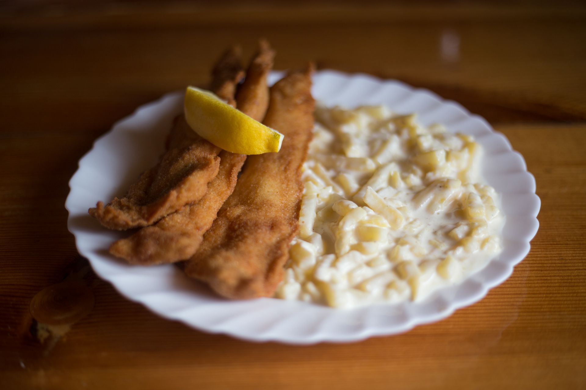 Rántott tengeri sügér, majonézes krumplisalátával (7,20 €)