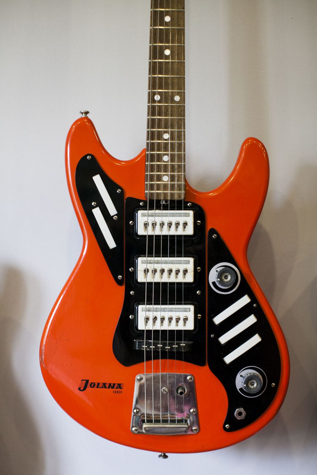 Az 50 éves Jolana egy csehszlovák elektromos gitár. Egy kollégámtól van, kinek az édesapja gitározott, de sajnos már nem él. A gitár gazdátlanul csak porosodott otthon. A kollégám úgy látta jónak, ha a hangszer nem vész kárba érzelmi töltete miatt, így felajánlotta nekem (köszi, Miki!). Én ígéretet tettem neki, hogy nagy becsben fogom tartani. Elküldtem Budapestre egy profi hangszerészhez “rehabilitációra”. Két potisapkán kívül minden alkatrésze eredeti. Különlegessége, hogy a régi Eta porszívókból jól ismert kapcsolókkal lehet vágni a magas frekvenciákat, amitől duruzsoló és a mély frekvenciákat, melytől ilyen citerásabb hangzása lesz. Nagyon old school a hangja. Ha jól tudom, a legendás brit BURNS gitárokról másolták a csehszlovák gyárban. Persze a megfelelő technológia hiányában nem lett olyan legendás, mint az eredeti. Manapság inkább gyűjtői értékkel bír.