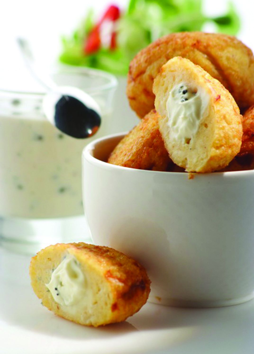 RECEPT: Sajttal töltött kölesgombóc zöldborsómártással, salátával