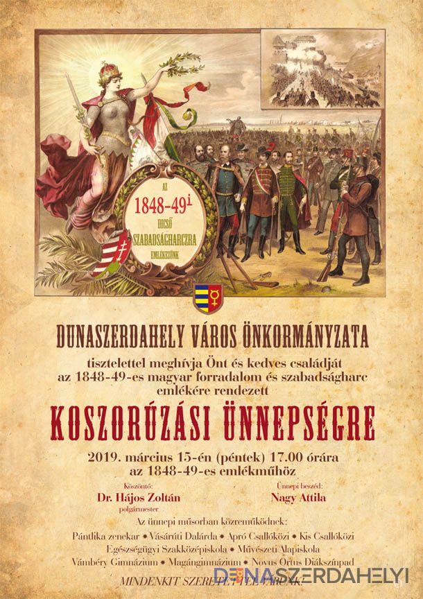 Dunaszerdahely Város Önkormányzata tisztelettel meghívja Önt és kedves családját az 1848/49-es magyar forradalom és szabadságharc emlékére rendezett koszorúzási ünnepségre.