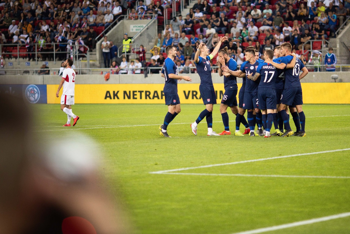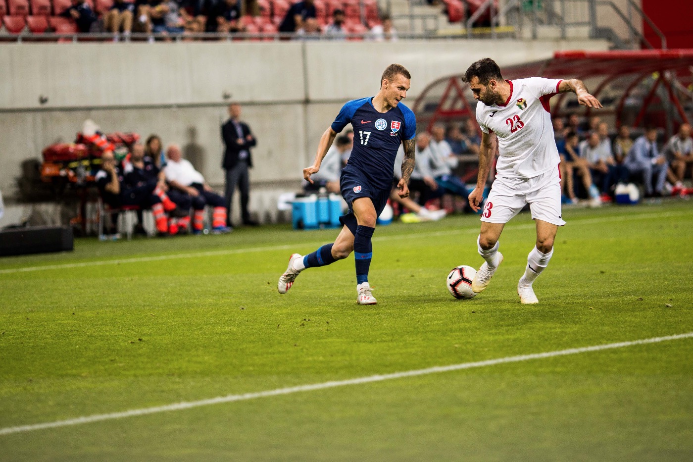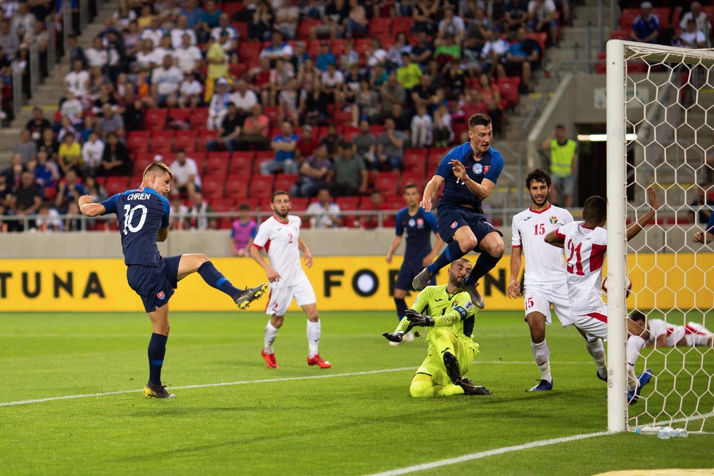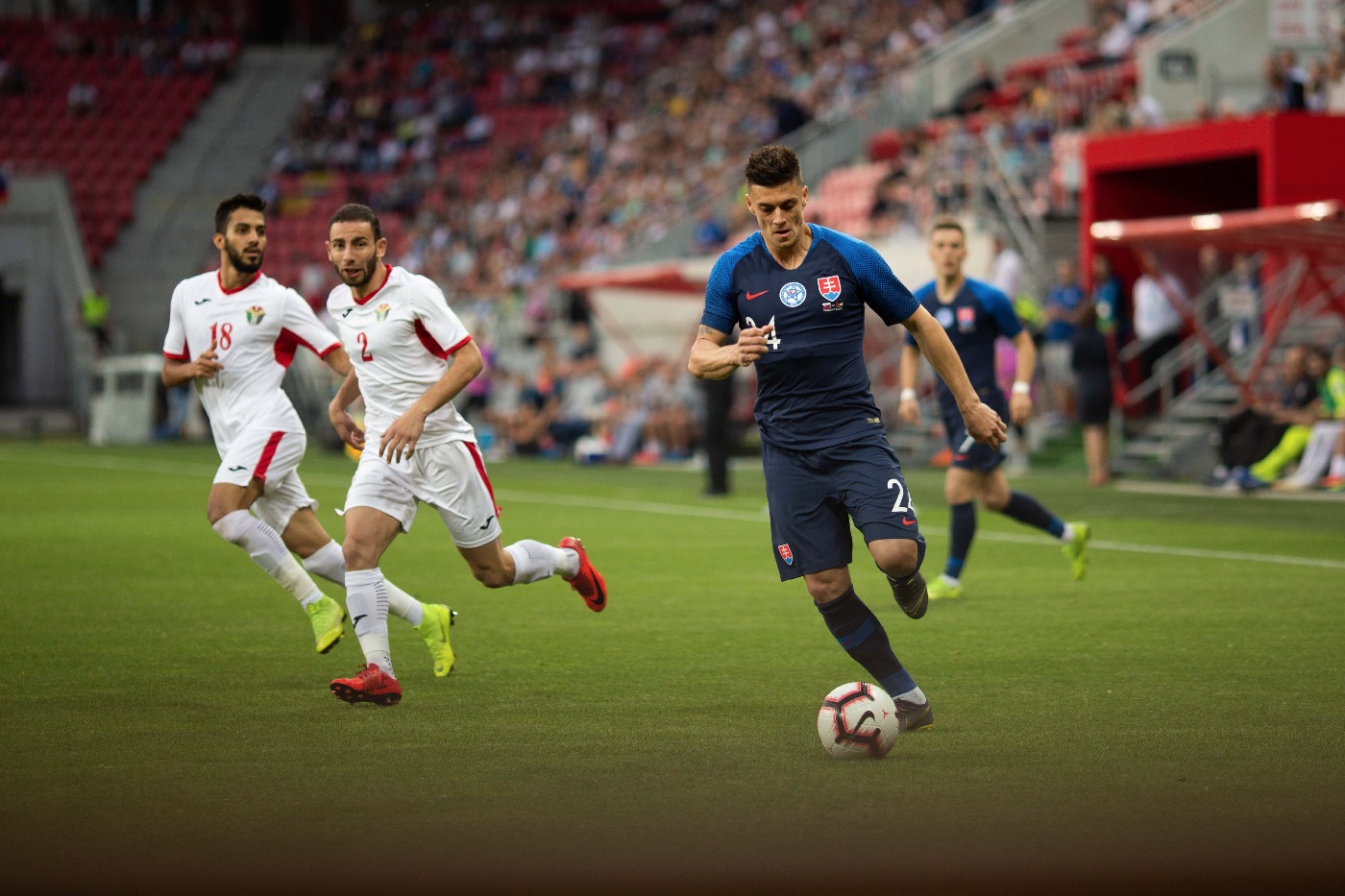 Az Európa-bajnoki selejtezőcsoportban szereplő szlovák válogatott – Bénes Lacussal, a Borussia Mönchengladbach játékosával (a tavaszi szezonban a Holstein Kiel vendégjátékosa), valamint Ľubomír Šatkával, a DAC játékosával az élen – tegnap barátságos mérkőzést játszott Jordániával a nagyszombati stadionban, ahol a hazaiak 5:1-re legyőzték a vendégcsapatot. Fekete Nándor fotógalériája.