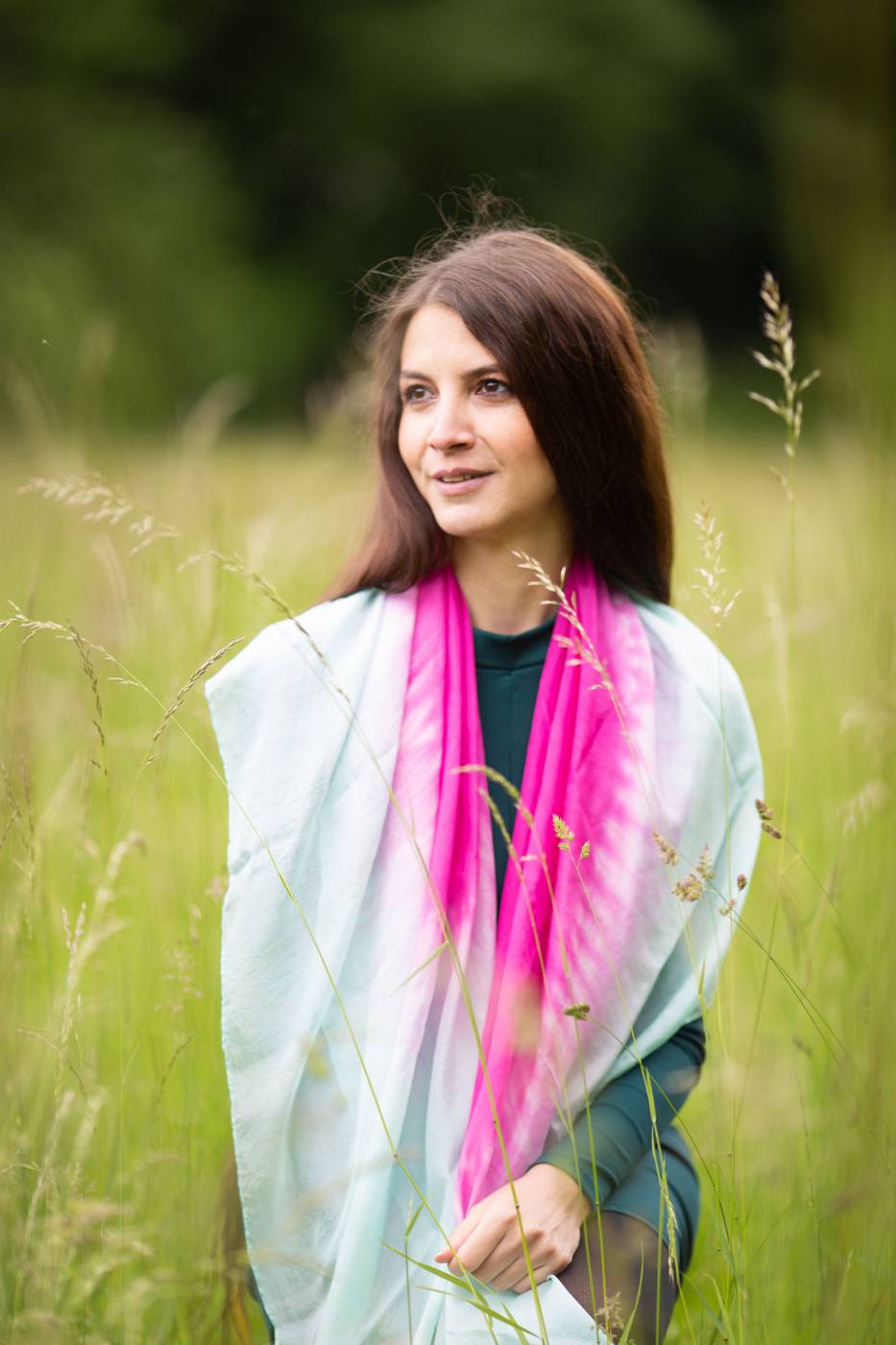 A növényi festésen belül az ecoprint az, ami jelenleg a fantáziámat leginkább izgatja, tanulmányozom ezt az eljárást, amivel növények lenyomatát gőzölik a textilbe. Abból a számtalan sugallatból, ami szinte minden pillanatban megérint, most az emberek ihletnek és mozgatják a képzeletem, mivel egyre több egyéni megrendelést kapok. Szabad kezet adnak, így a velük kapcsolatos megérzéseimet bátran és önfeledten rakhatom ki magamból színek és minták alakjában az anyagra, az egyént sál formájában megtestesítve.