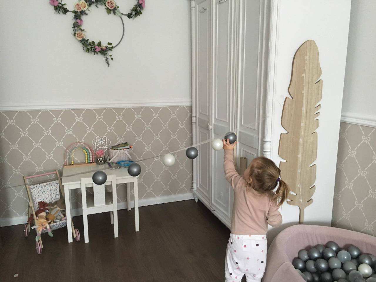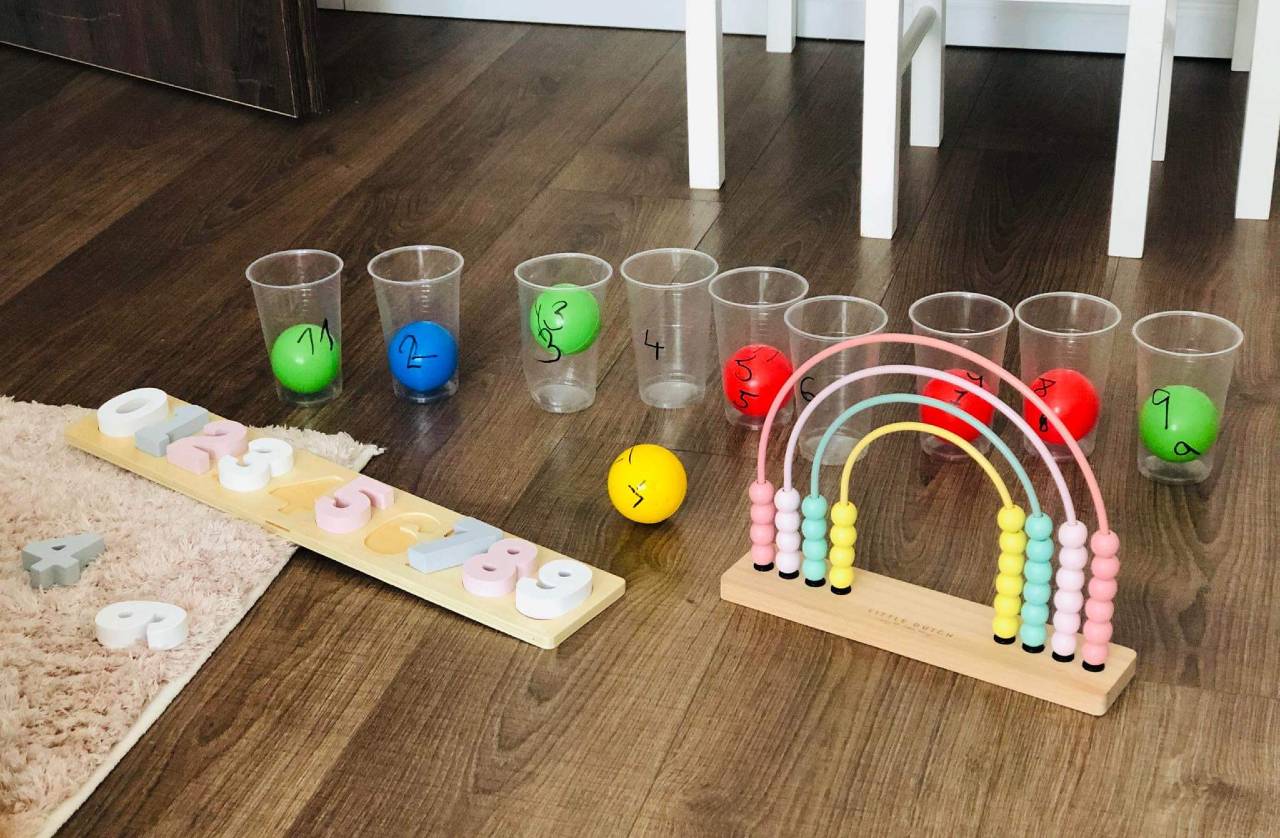 Nagy segítségemre van ebben a Pinterest és az Instagram, innen merítem az ötleteket,  pl. számokat tanulunk labdák és poharak segítségével (az adott számot viselő labdát kell beledobni ugyanazon számot viselő pohárba), közben pedig meg is kell keresnie a fából készült megfelelőjét is, és szintén a megfelelő helyre tenni.
