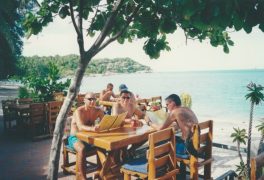 Hova is menjünk ebédelni? – hangzott el a kérdés… Mivel már farkaséhesek voltunk, így a közeli tengerparton elhelyezett asztaloknál, egy kis kunyhó előtt leltünk rá az éttermünkre. Hét ágra sütött a nap, nagyjából 38 fok meleg volt árnyékban. Kérjük az étlapot, kapjuk a jéghideg üdítőt, és szemezgetünk a kínálattal. Az ételeket olvasva fogalmunk sem volt, miféle az ételkínálat, hiszen Jóska, Imre és Igor Dunaszerdahelyről honnan is tudta volna, milyen falatok is vannak ott feltüntetve. Így az otthoni szokásokhoz hasonlóan gondoltuk, rendelünk egy levest, és másodjára egy főételt, akárcsak odahaza. Néztek is jó nagyot a thai pincérlegények, ám ránk hagyták a döntésünket. Életemben először találkoztam a TOM YUM elnevezésű levessel, amit tenger gyümölcseivel kértem…
