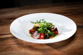 A vegán ételeknek hatalmas rajongója lettem az utóbbi két-három évben, így a csapaton belül szinte mindig én vagyok az, aki lelkesedem az ilyen felhozatalokért. Sokak számára elképzelhetetlen, hogy valójában miből is készülnek a vegán sajtok. A válasz: a szójatejjel, kókuszolajjal, rizzsel, magvakkal és egyéb összetevőkkel érik el a gyártók a szinte megtévesztően hasonló textúrát és ízvilágot a valódi sajtokkal szemben. Ez az előétel valami eszméletlenül finom volt! A marinálás nem más, mint az alapanyagok bizonyos fűszerkeverékben való áztatása, ami jelen esetben az egyik legnagyobb kedvencem, az édeskés málnaecet, amelytől a zöldség teljesen roppanós maradt, a grillezett vegán sajttal társítva pedig teljesen levett a lábamról. Nem biztos, hogy minden „ragadozó” emberkének bejön az étel, de én imádtam…