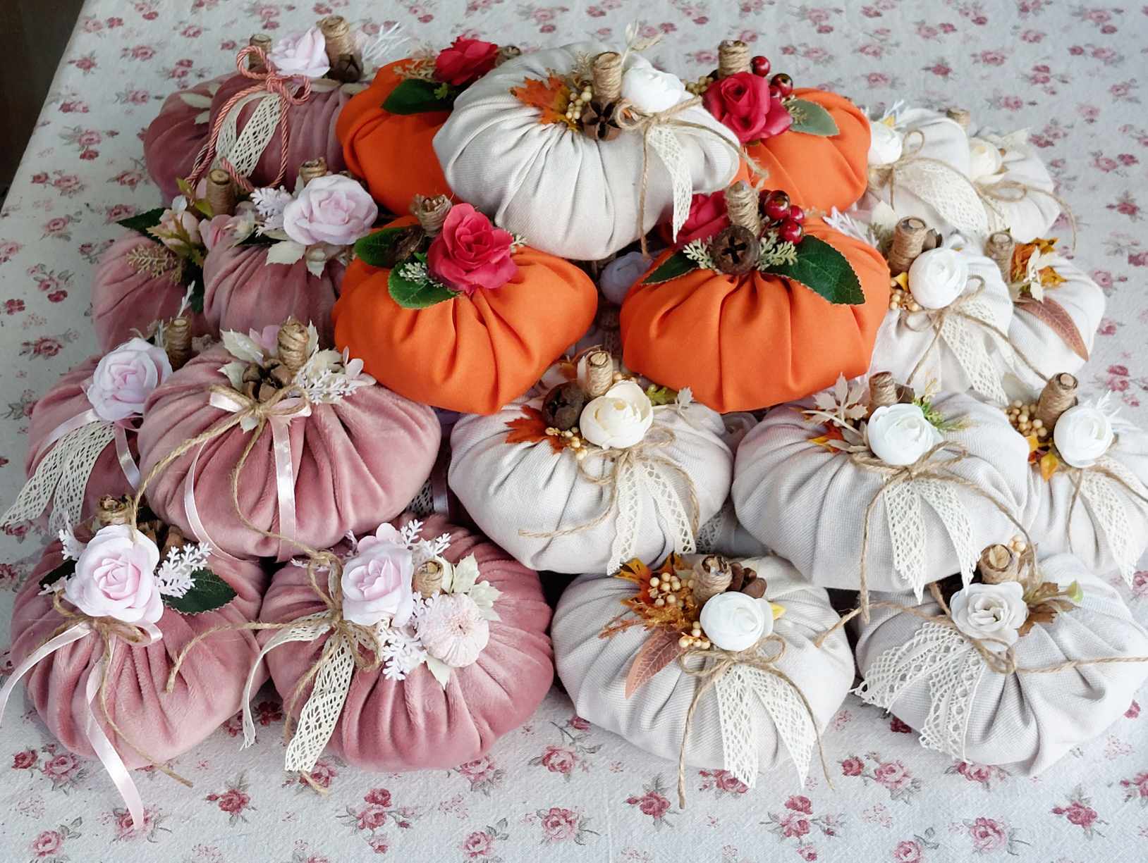 A legtöbbször selyemvirágokkal dolgozom, mivel ez maradandó. Ragasztópisztolyt használok. Kedvenc színeim a rózsaszín és a fehér. Az elkészült dekorációk a lakásunkat díszítik, amíg nem találnak új gazdára. Sokszor úgy a szívemhez nőnek, hogy szinte sajnálom, amikor elviszik. Minden egyes termékemet sok szeretettel készítek, és remélem, ezt érzik is rajtuk.