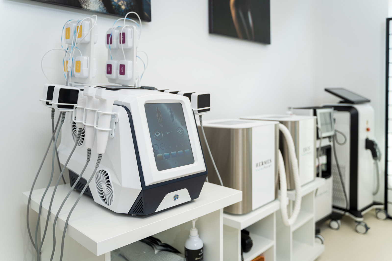 A testkezelő gépünk rendelkezik elektromos izomstimulációval (EMS), ami egy terápiás módszer az izmok erősítésére, de ezen kívül beindítja az anyagcsere-folyamatokat és energiát is égetünk vele. Tehát használható testedzésre, rehabilitációs kezelésként és kozmetikai célokra egyaránt. Ez a gépünk rendelkezik még a monosculpt eljárással, ami egy rádiófrekvenciás zsírbontó technika, ami nem csak kipréseli a zsírsejtekből a zsírt, hanem ténylegesen apoptózison (sejthalál) mennek keresztül, amit aztán a szervezet természetes úton kiürít. A gépen található még rádiófrekvenciás feszesítés is, ami a nők körében nagyon közkedvelt, hiszen míg a férfiaknak csak a 20%-át, addig a hölgyeknek 80%-át érinti a narancsbőr. Ehhez a kezeléshez ultrahang gél helyett kimondottan feszesítő gélt alkalmazunk, és a minél hatékonyabb eredmény elérése érdekében speciális szérumkoktélokat is.