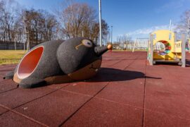 Amit egykor a nagyfiammal a szabadidőpark játszóterén átéltünk, az várt ikergyermekeinkre is. Addigra eltűnt a várdomb, elbontották. Helyére hasonló, de már nagyon uniós „norma-szagú” játékegység került, amelynek egyik eleme a zöld, karikás csúszda.