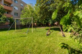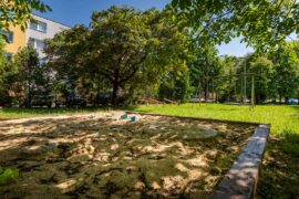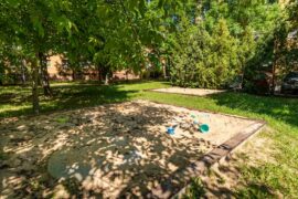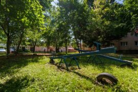 Most pedig képzeletben átsétálunk a Svoboda tábornok utcába, ami mindössze egy-két percet jelent. Az utca első és második blokkja között máris ott a következő játszótér, két homokozóval és két libikókával. Itt mindössze ennyi a kínálat, illetve a padok. A „szocis” homokozók közül szemmel láthatóan csak az egyik van fenntartva, viszont az is gyakran házikedvencek toalettje, ezért nem is járunk ide. Pedig a játszótér meglehetősen árnyékos helyen van, és a kutyák sétáltatása is tilos! – legalábbis a kihelyezett tábla ezt mutatja. A két libikóka újabb darab lehet, a múlt rendszerben ez a fajta kialakítás nem volt megszokott.