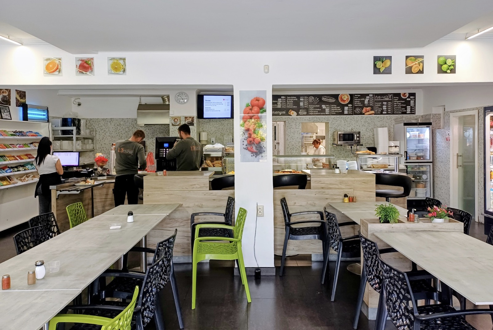 És a bolt mellett jó ideje ott a Baranyai Falatozó, oldalt talponálló részleggel, középütt asztalokkal és székekkel. Pont, mint anno a Tejbüfében!