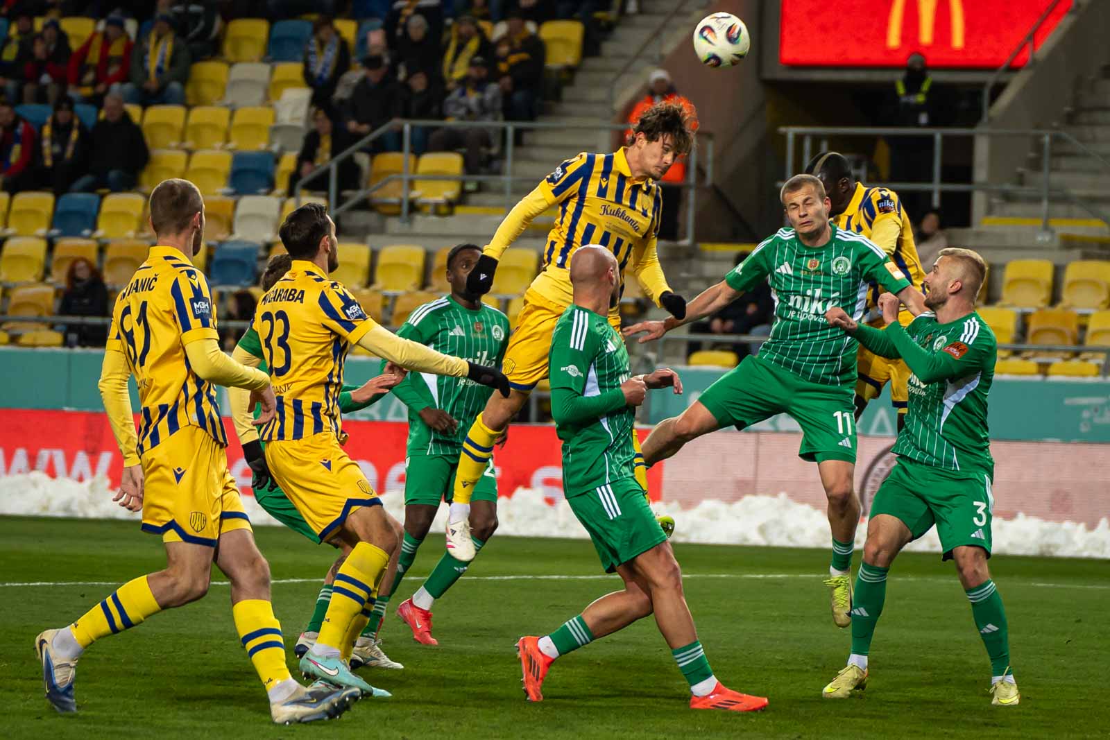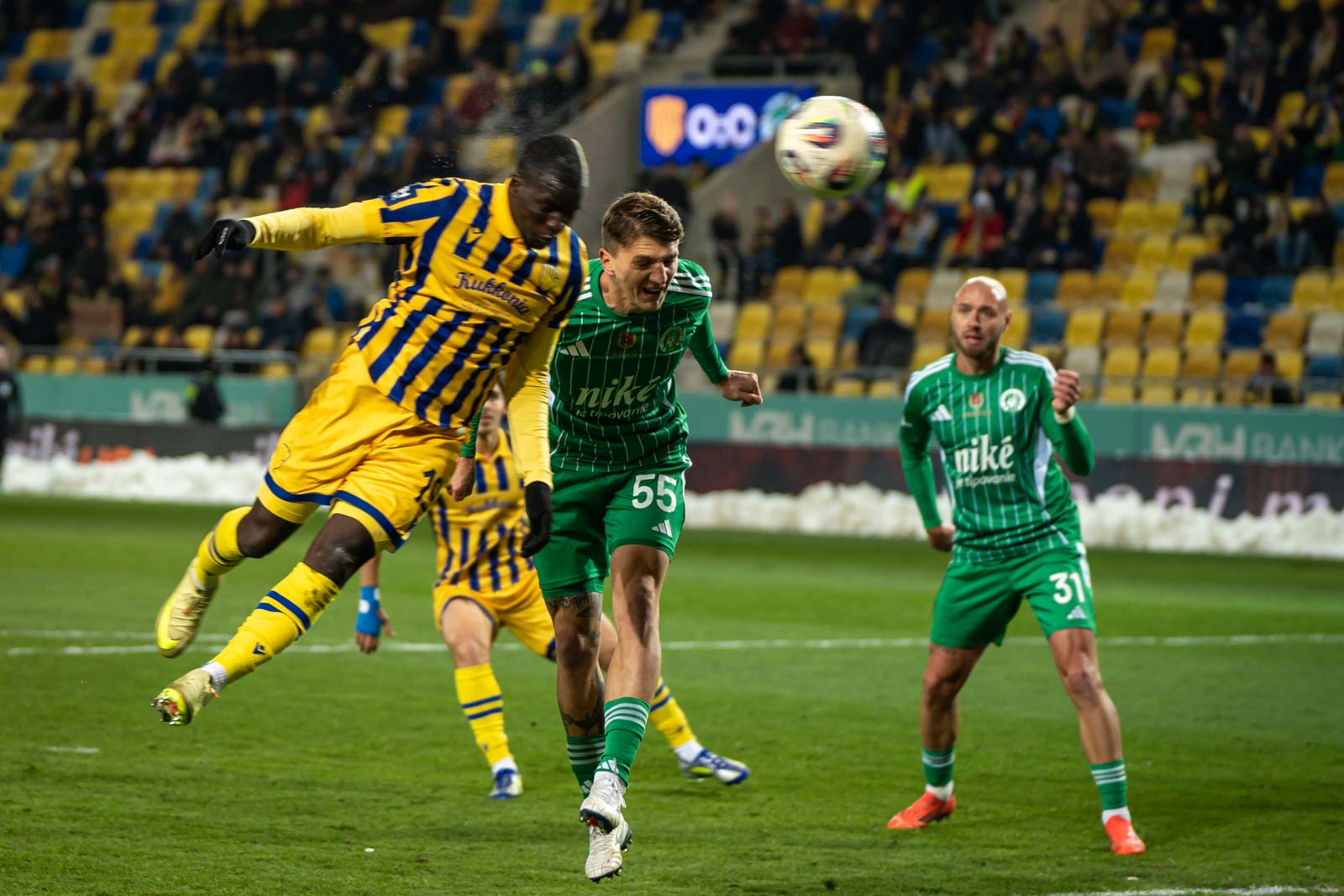 Mivelhogy reggelre szolid hóréteg lepte be a környéket, előkerültek a szánkók, és néhány hóember is életre kelt. Az első hó mindig örömet okoz, pláné, ha megmarad, erre pedig az alacsony hőmérséklet volt a garancia. Így aztán a MOL Aréna pályagondnokai már kora reggeltől azon dolgoztak, hogy a játéktér minél jobb állapotban legyen, ami szemmel láthatóan sikerült is nekik. Este hat órára az égi áldásra mindössze a pálya körüli hókupacok emlékeztettek, az évszakra viszont a -2 fok és a mindössze 3549 lelátókon „korcsolyázó” néző. Nem éppen ideális, de nem is tragikus, gondolhattuk magunkban, látva elszántságunkat az első tíz percben.