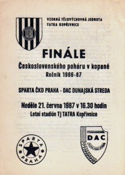 Csehszlovák kupadöntő, 1987. 06. 21., Kopřivnice: Sparta Prága – DAC 0:0 hosszabbítás után, tizenegyesekkel: 2:3. DAC: Vahala – Kapko, Šrámek, Liba, Fieber – Krištof, Pavlík (75. Michalec), Kašpar – Šoltés, Mičinec, Bartoš (114. Medgyes). Edző: Pecze Károly.