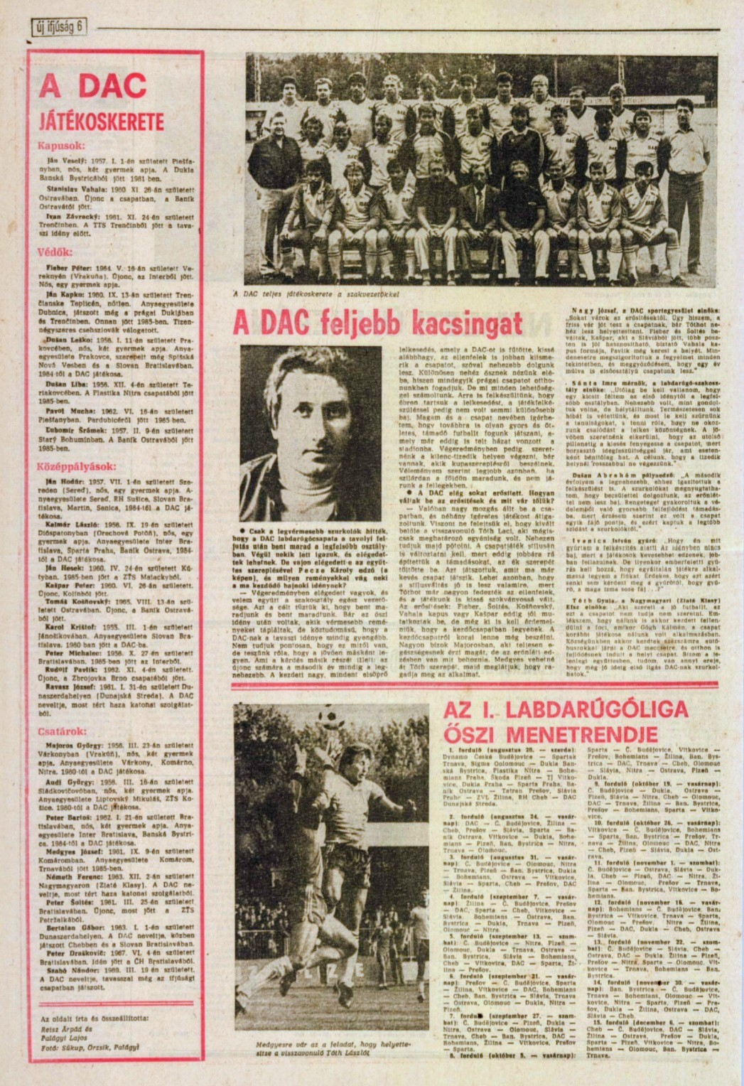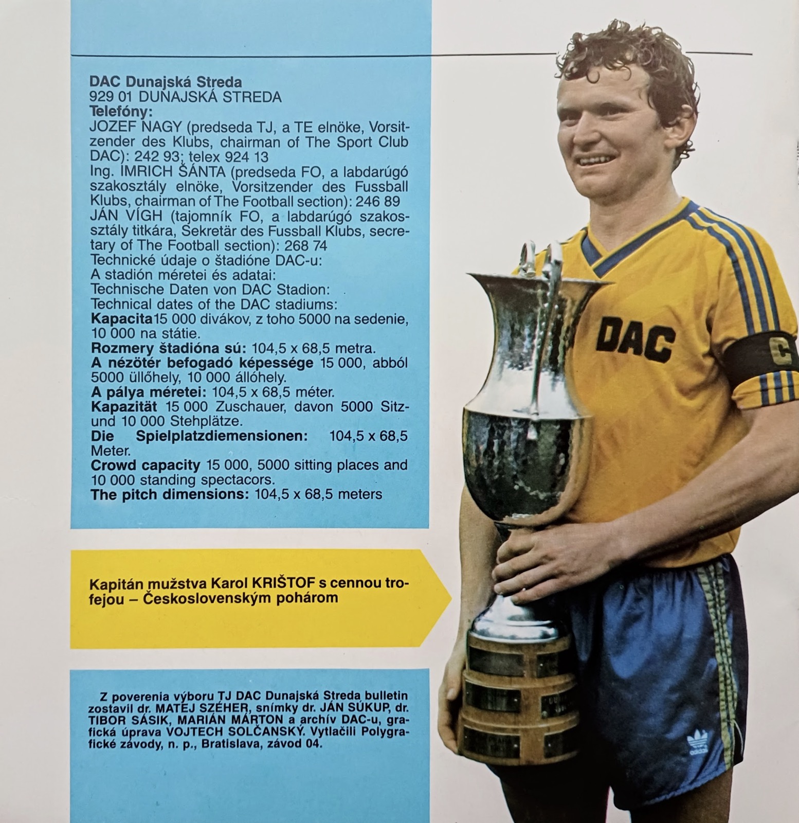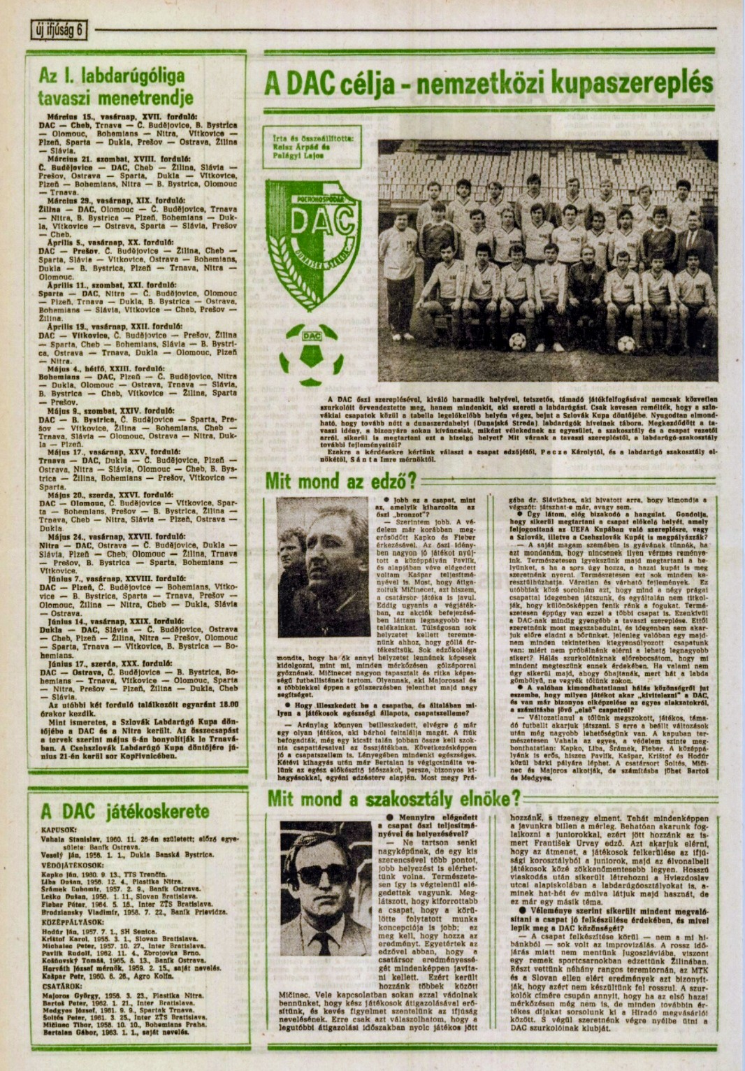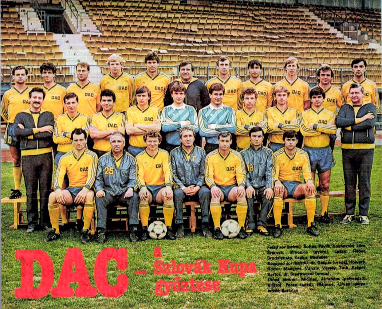 Borítóképünkön a kupagyőztes DAC csapata a kopřivnicei döntő után. Álló sor, balról: Pecze Károly vezetőedző, MUDr. Stadtrucker Sándor orvos, MUDr. Miroslav Gašpar orvos, Majoros György, Ján Veselý, Dušan Liba, Rudolf Pavlík, Pósa Lajos buszsofőr, Reisz Árpád csapatvezető, Šanta Imre szakosztályelnök, Medgyes József, Dušan Leško, Ľubomír Šrámek, Vígh János szakosztálytitkár, Stanislav Vahala. Középütt: Fieber Péter. Alsó sor, balról: Ján Kapko, Simonics István gyúró, Tibor Mičinec, Dušan Abrahám másodedző, Peter Bartoš, Karol Krištof, Peter Michalec, Petr Kašpar, Peter Šoltés, Petes Lajos vezetőségi tag.