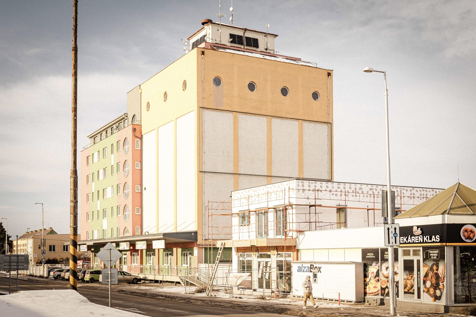 A Pozsonyi út mellett, a vasútállomással szemben áll egy érdekes épület. Legalábbis számomra formás, tetőtéri „tornyával” az átutazó akár várnak vélhetné.