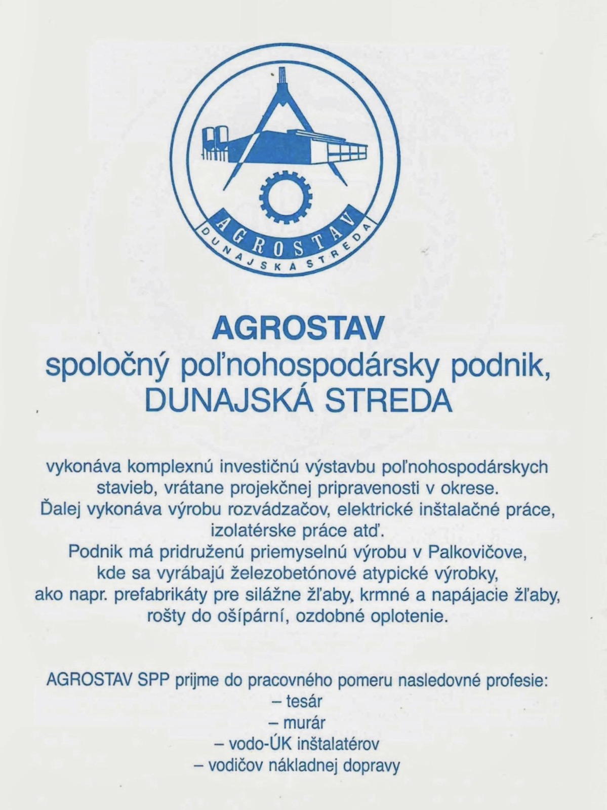 Agrostav elnevezéssel az ország több járásában (régiójában) is találkozhattunk, mi természetesen a Dunaszerdahelyi járás viszonylatát fogjuk tárgyalni. Nem állítom, hogy minden üzemet úgy ismerek, mint a tenyeremet, de minimum Agrostav felirattal gyakran találkoztam. Részint a DAC-stadionban, részint a futballmérkőzésekre kiadott műsorfüzetekben. Nyolcadik emeleti balkonunkról kitekintve pedig a víztornyon kívül egyetlen magas épület látszódott a város déli horizontján: az Agrostav igazgatóságának székháza az Ipari utcában. Magasabb volt a jegenyefáknál is, pedig azok az „égig érnek”. Hogy végül nem lettem agrostavos, az az ország akkoriban végbement társadalmi és gazdasági változásainak volt betudható. Az inasiskola elvégzése után ugyanis 1993-ban munkavégzés céljából az Agrostavhoz (akkor már AGS Dunstav) is beadtam a kérvényem, de az építkezések éppen stagnáltak, és egyébként sem lett volna szükség gyakorlat nélküli vízvezetékszerelőre. 1982-ben talán több sikerrel jártam volna? Na, de szokás szerint kezdjük a legelején…