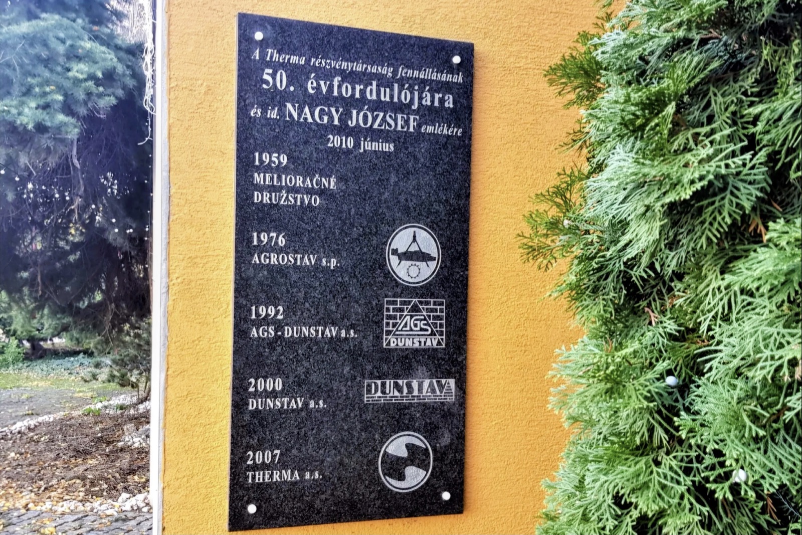 „A Therma részvénytársaság fennállásának / 50. évfordulójára / és id. Nagy József emlékére / 2010 június / 1959 / Melioračné družstvo / 1976 / Agrostav s.p. / 1992 / AGS Dunstav a.s. / 2000 / Dunstav a. s. / 2007 / Therma a.s.” – emléktábla a Hotel Therma főbejárata mellett