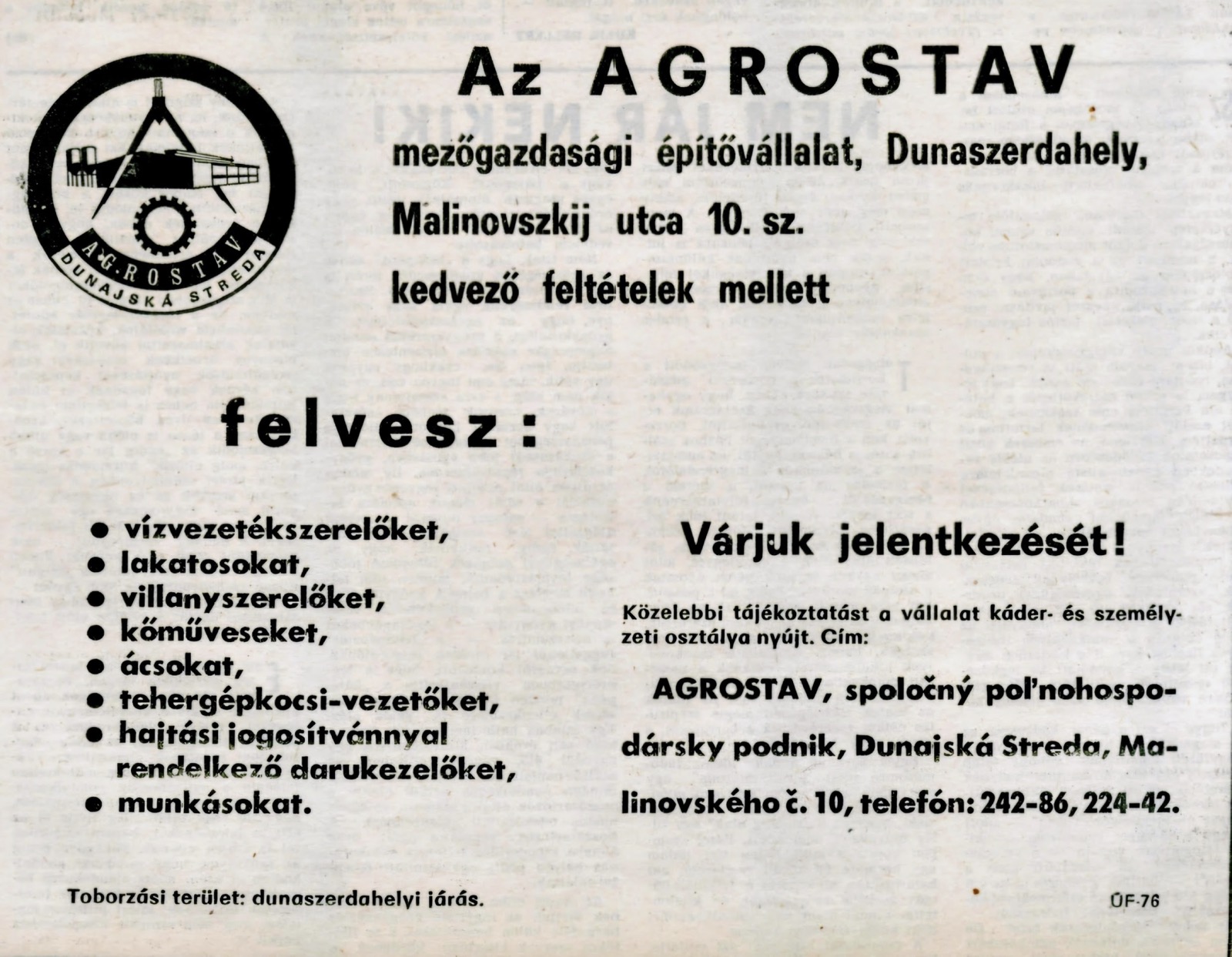 „Az Agrostav Vállalatok alakulatainak szervezeti elrendezését mindenkor a mezőgazdasági üzemek tervében testet öltő társadalmi igény szabja meg. Ennek megfelelően a kezdetben a dunaszerdahelyi mezőgazdasági építővállalat építőblokkokat és betonoszlopokat gyártott, kanálisokat készített, s ehhez mérten alakította ki belüzemi szervezetét is. Amint létrejöttek az integrációs viszonyok, azonnal korszerűbb szervezeti elrendezést vett fel. Projekciós részleget létesítettek a hozzá szükséges jól képzett szakemberekkel. A belüzemi szervezést alárendelték a partnerek igényeinek. Majd építési részleget hoztak létre szintén jó szakemberekből, s amikor a terményszárítók kivitelezésén volt a sor, újabb részleget, segédüzemágat alakítottak ki, vízvezeték-, villany- és más szerelők bevonásával. Ezeknek többsége nem egy, hanem több szakmát is elsajátított, s ha a helyzet úgy kívánja, azon a szakaszon foglalkoztatják, ahol arra szükség van. Az építővállalat tehát jól szolgálja a mezőgazdaságot…” – Szabad Földműves, 1977. 02. 12.