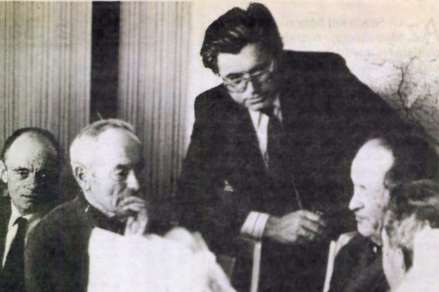 Nagy József mérnök az Agrostav 1983-as nyugdíjas találkozóján, immár a vállalat új székházában – ÚjSzó Vasárnap, 1983. 04. 01.
