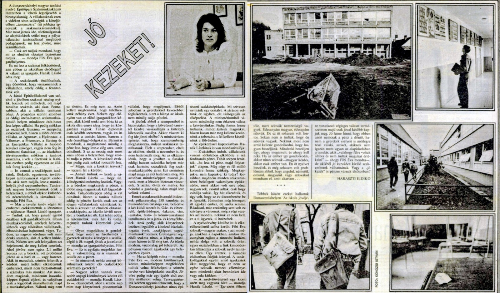 „A dunaszerdahelyi magyar tanítási nyelvű Építőipari Szakmunkásképző Intézetben a lehető legteljesebb a bizonytalanság. A vállalatoknak ezen a vidéken sincs szükségük a közeljövőben tanoncokra… Mi az elméleti oktatást biztosítani tudjuk – mondja Fibi Éva igazgatóhelyettes. És mi lesz a szakmai felkészítéssel, ami ebben az iskolában elsődleges? A választ az igazgató, Hanák László adta meg: A szakoktatók önállósulnak úgy döntöttek, hogy visszamennek a vállalathoz, amely eddig a fenntartónk volt. A Járási Építővállalatról van szó, ahol a jövőben szakmai részleg nyílik, lesznek ott műhelyek, ott majd tanulhat szakmát, aki akar. Pontosabban, akit a vállalat taníttatni óhajt…” – Nő, 1990. 12. 04.