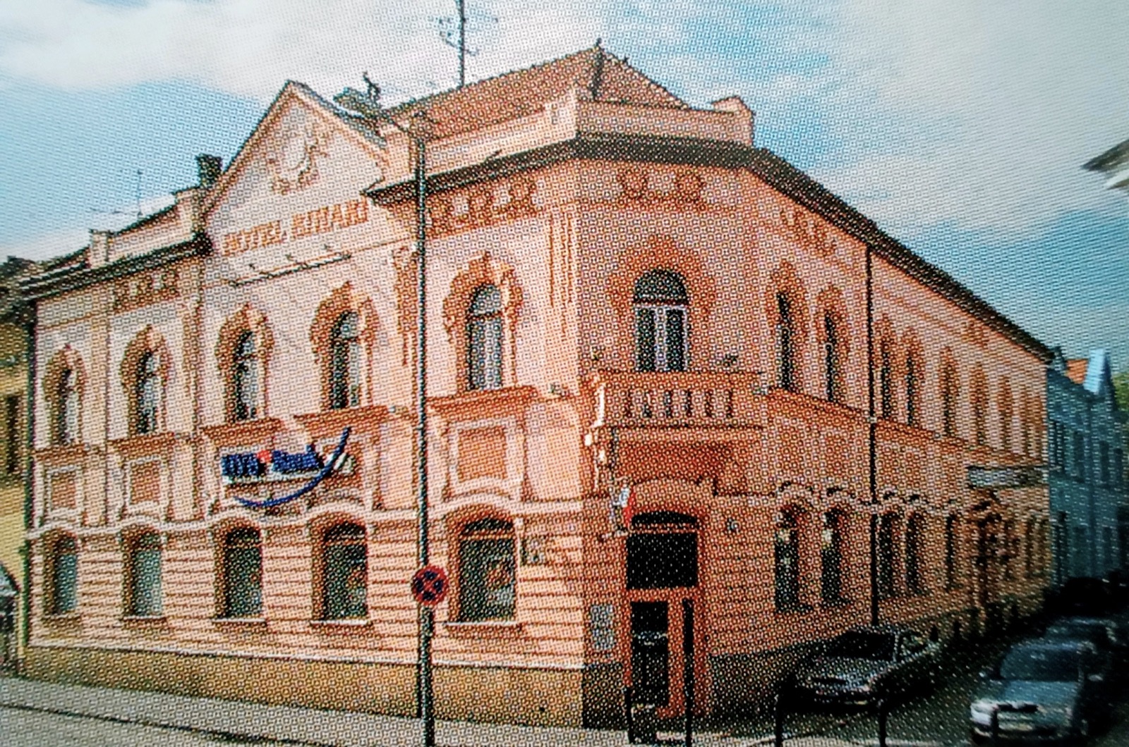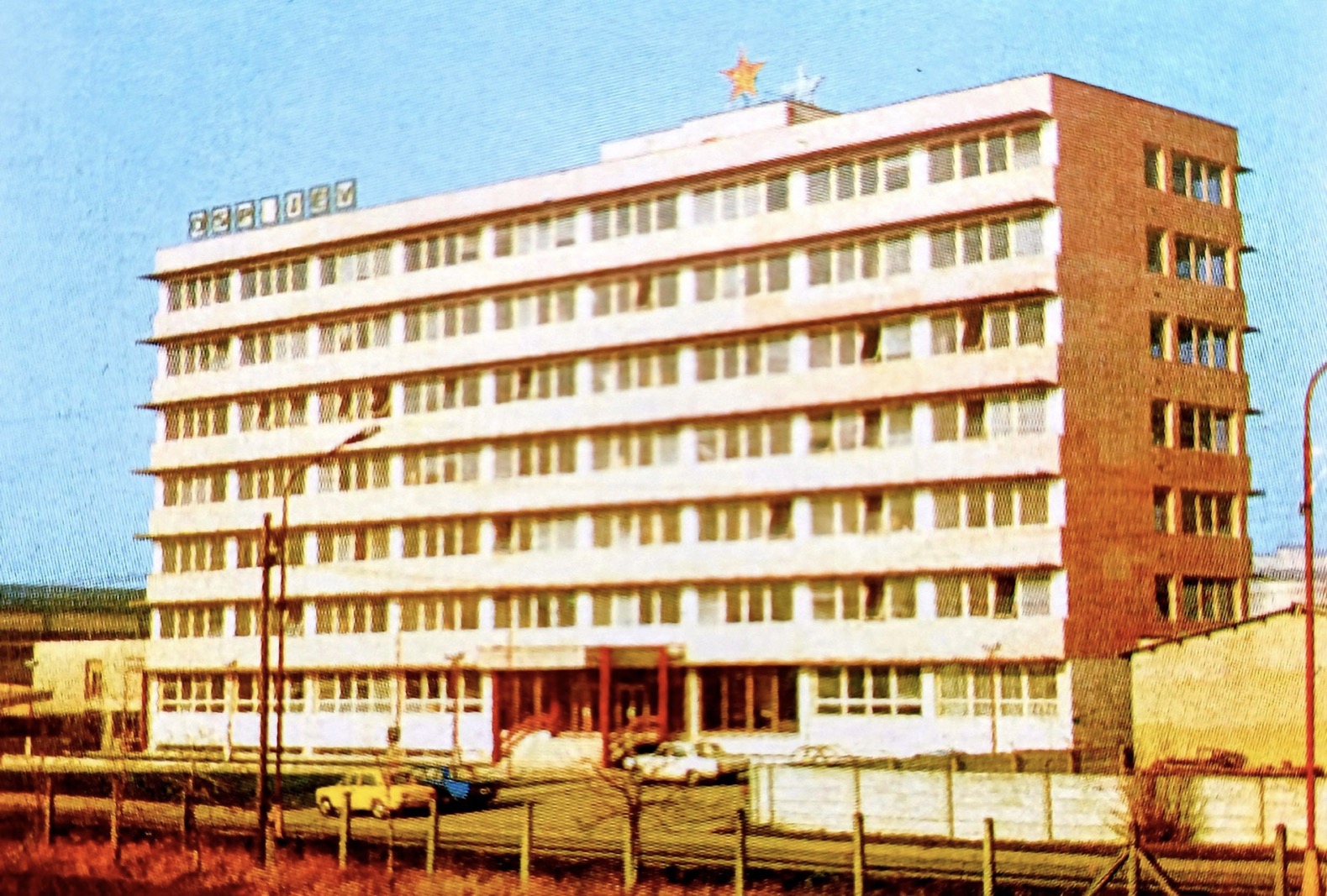 Az egykori Léwald-szálló 1980 környékén. Az épülettől jobbra volt a vállalat bejárata, a kapu felett „Okresný Stavebný Podnik – Járási Építőipari Vállalat” felirattal és az elmaradhatatlan vörös csillaggal