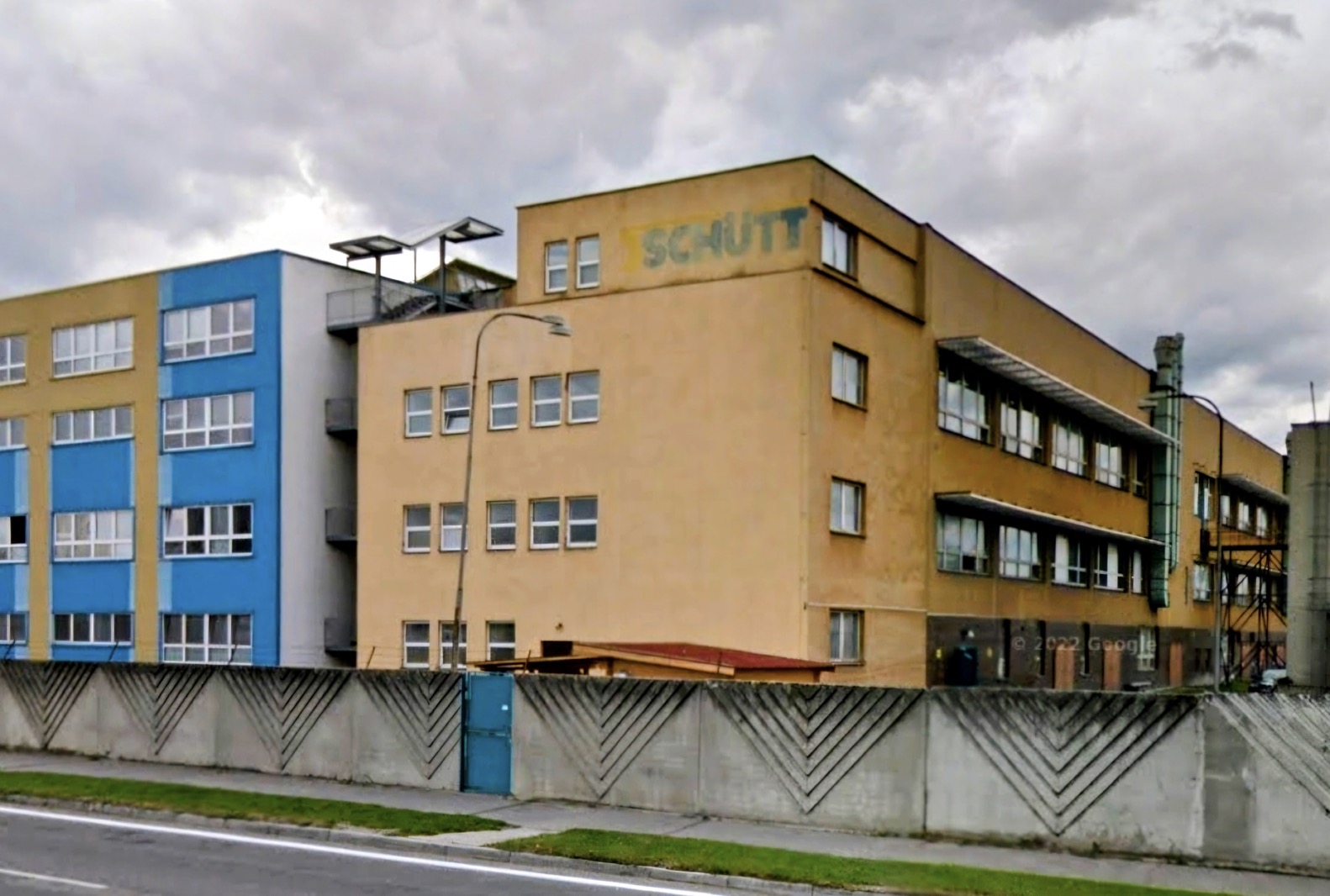 Néhány éve még látszódott a „SCHÜTT” felirat a Galántai út felől. A jobb oldali gyárcsarnok volt eredetileg a Progressoné, a bal oldali utólagos hozzáépítés