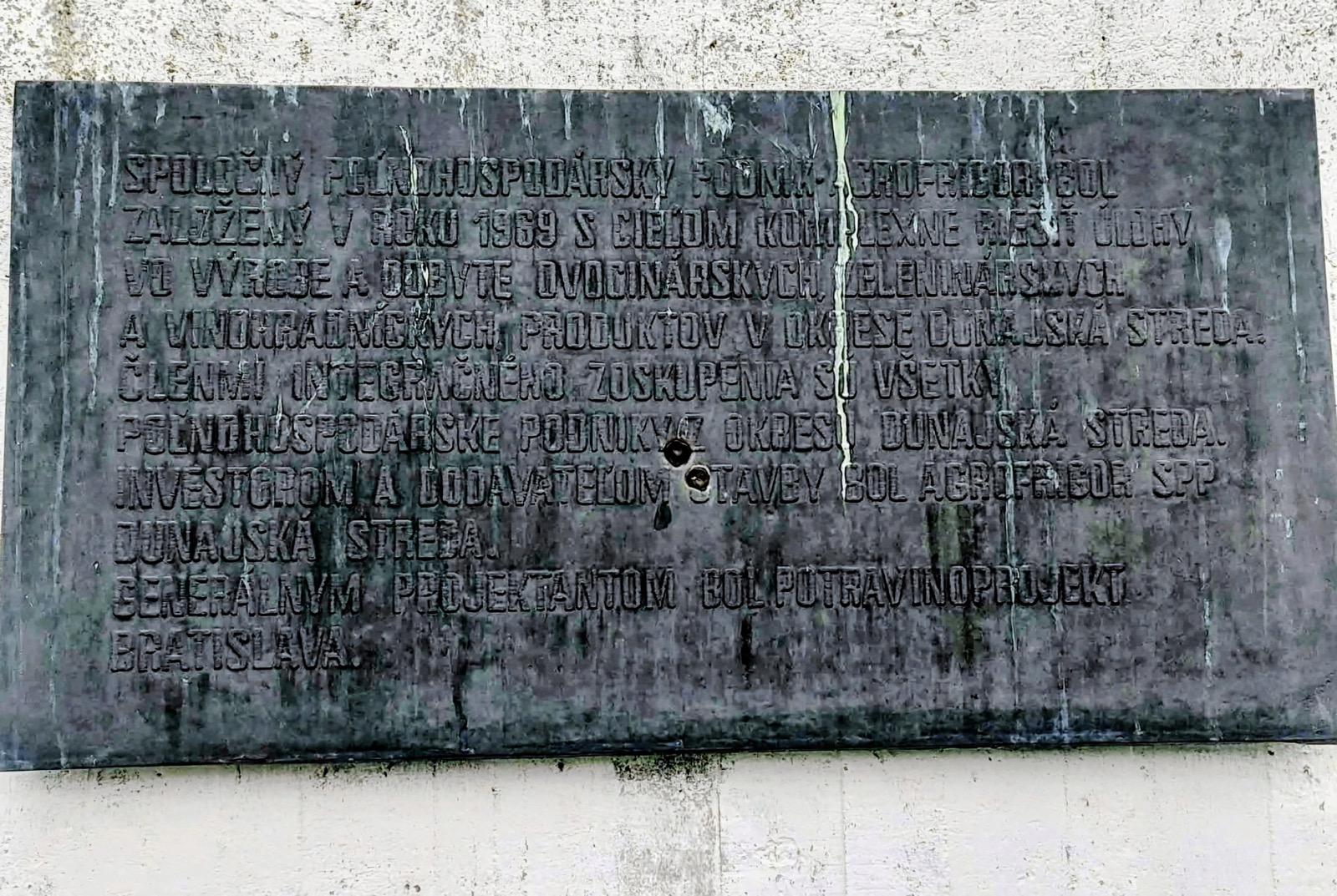 Magyar fordításban: Az Agrofrigor Közös Mezőgazdasági Vállalatot 1969-ben alapították azzal a céllal, hogy átfogóan megoldja a Dunaszerdahelyi járásban a gyümölcs, zöldség és szőlészeti termékek előállításával és értékesítésével kapcsolatos feladatokat. A Dunaszerdahelyi járás minden mezőgazdasági vállalata az integrációs csoport tagja. Az építkezés befektetője és megrendelője a dunaszerdahelyi Agrofrigor KMV. A beruházás főtervezője a pozsonyi Potravinoprojekt.