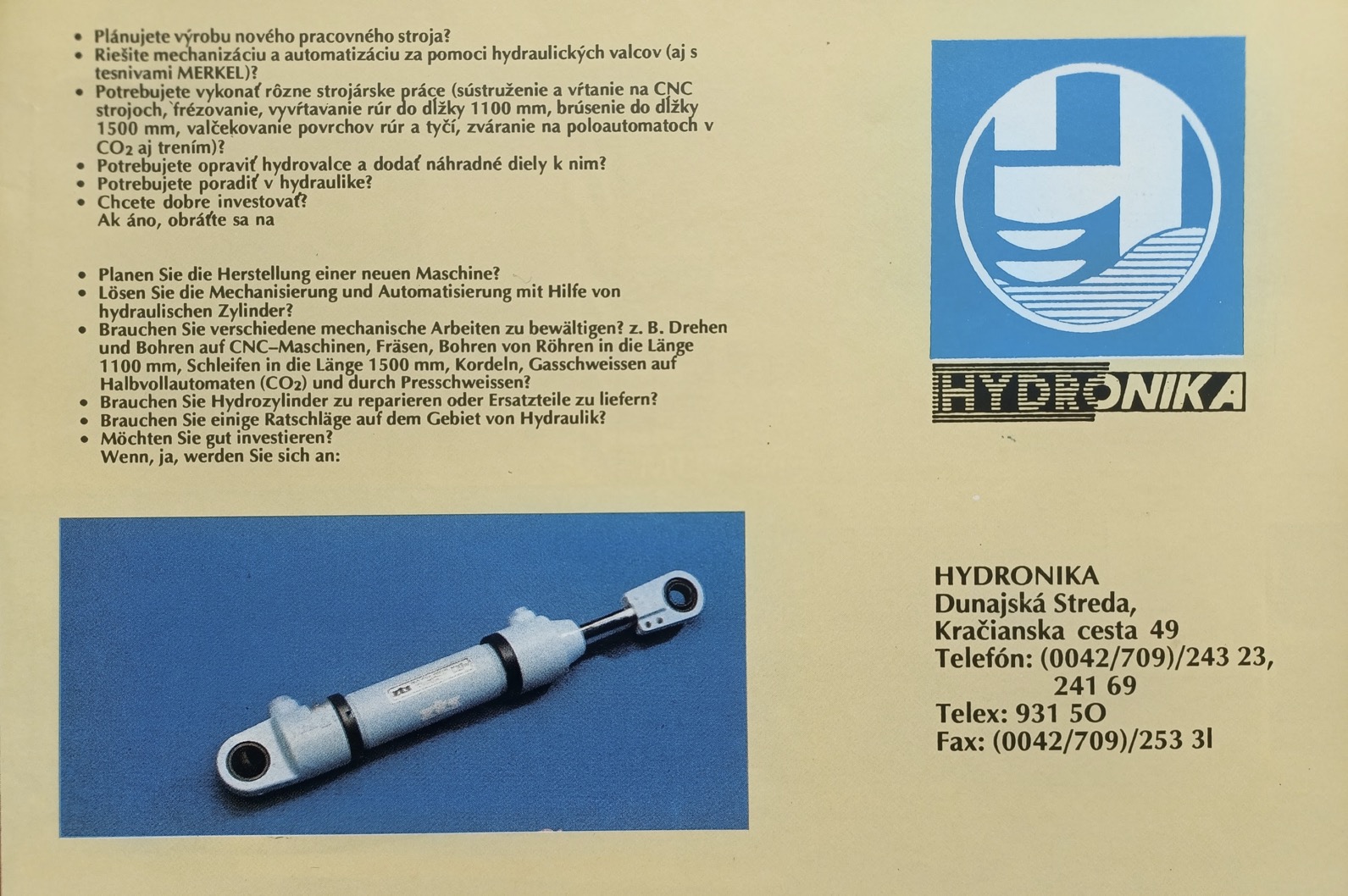 „Elsősorban a Csallóköz iparosítását tartottuk szem előtt, amikor 1975-ben megnyitottuk termelési-gazdasági egységünk új üzemét. Egy évvel később Dunaszerdahelyen már akkora lendületet kapott a gépipari gyártás, hogy az üzemből kikerülhetett a PNT-típusjelzésű hidromotorok első 60 ezer darabból álló sorozata. Ez követően fokozatosan növekedett az üzem kapacitása és megkezdődött a különféle rendeltetésű és méretű H-típusú hidraulikus hengerek teljes választékának gyártása. Az árutermelés éves értéke 1981-ben már elérte az 50 millió koronát. Az idén és a jövő évben egy kisebb méretű beruházásra kerül sor. Ennek nyomán megnagyobbodnak a szereldei belterület méretei, nyersanyagraktárral bővül az üzem, és 150 dolgozó számára a követelményeknek megfelelő szociális létesítmények készülnek el. 1984-ben és 1985-ben 10 milliló korona költségvetési keret felhasználásával kész- és félkészáruraktár épül. Ezek a beruházások elősegítik a gyártás további fokozatos növelését, amit termékeink iránti mind nagyobb kereslet tesz indokolttá. A gyártmányaink legnagyobb vásárlója a Szovjetunió. A már említett beruházás kivitelezése után 1985-ben egy újabb és sokkal nagyobb arányú beruházási program kezdődik. Összesen 238 millió korona ráfordítással megoldódik az üzem komplex fejlesztése. A gyártóterület jelentős kibővítésén kívül a többszörösen megnövekvő termeléshez szükséges kiszolgáló épületek és további szociális létesítmények is szerepelnek a jóváhagyott végrehajtási tervekben…” – ÚjSzó, 1983. 06. 25.